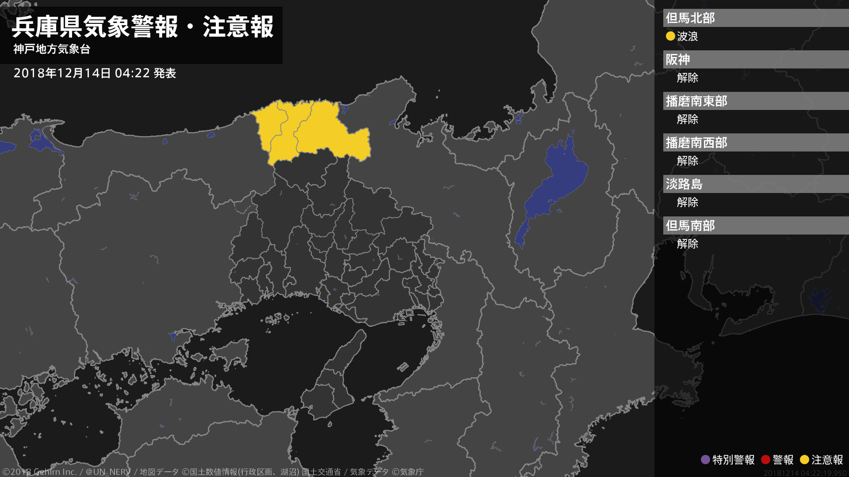 【兵庫県 気象警報・注意報 2018年12月14日 04:22】北部では、14日夕方まで高波に注意してください。#気象警報注意報 #兵庫県