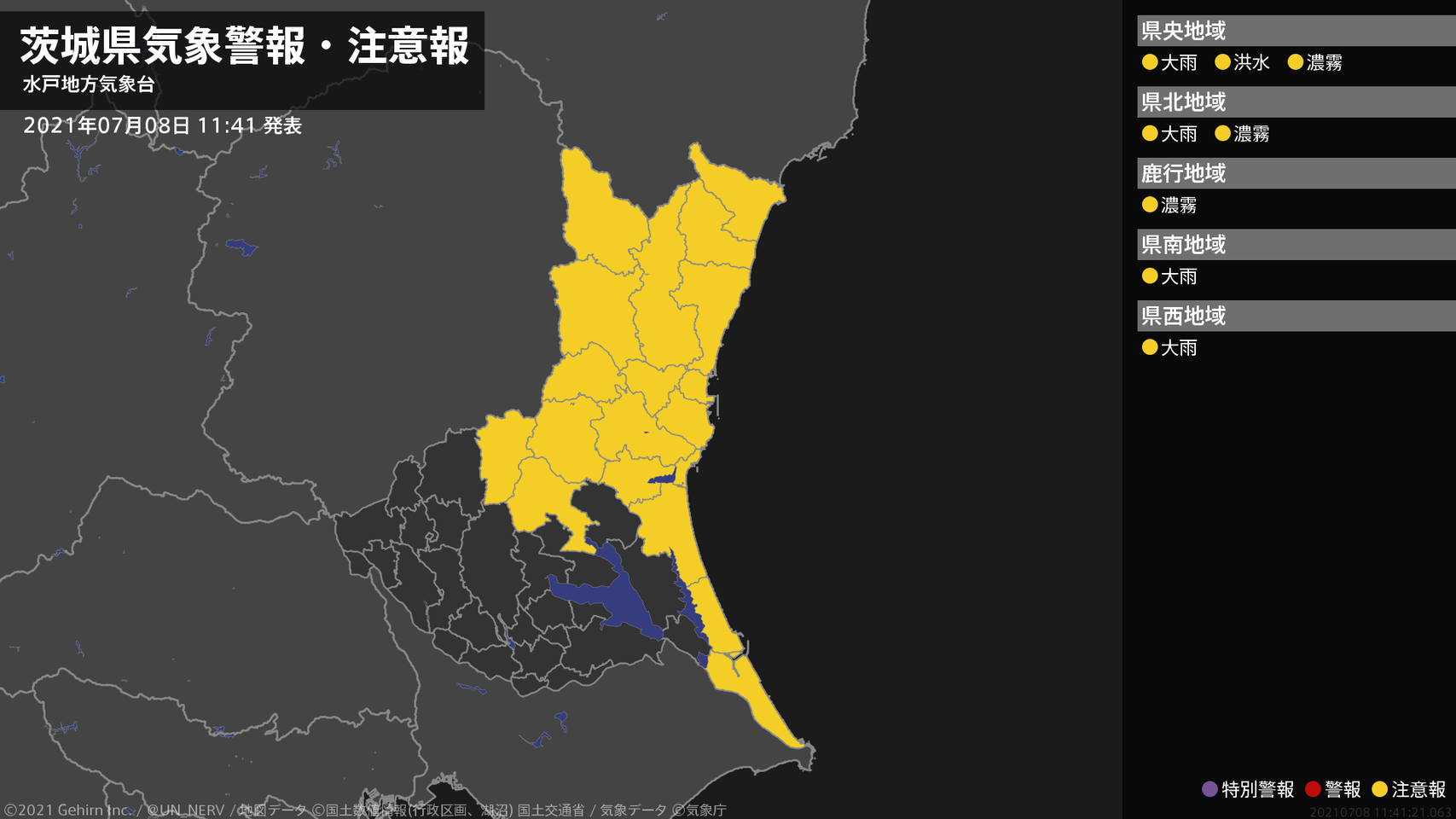 【茨城県 気象警報・注意報 2021年07月08日 11:41】