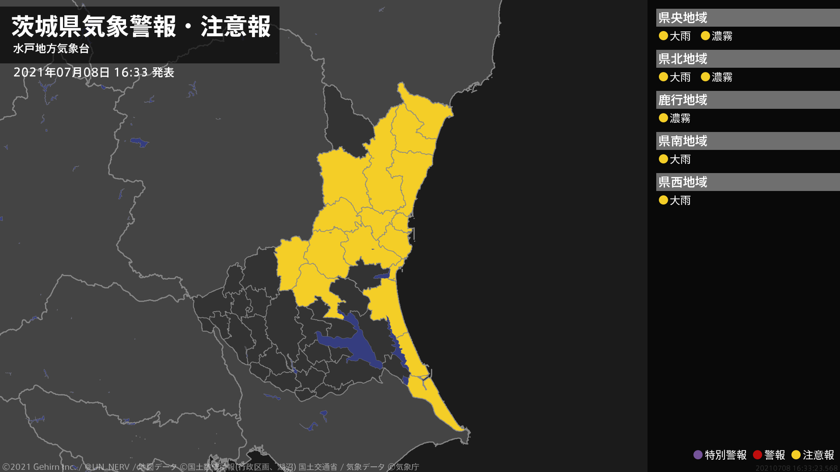 【茨城県 気象警報・注意報 2021年07月08日 16:33】