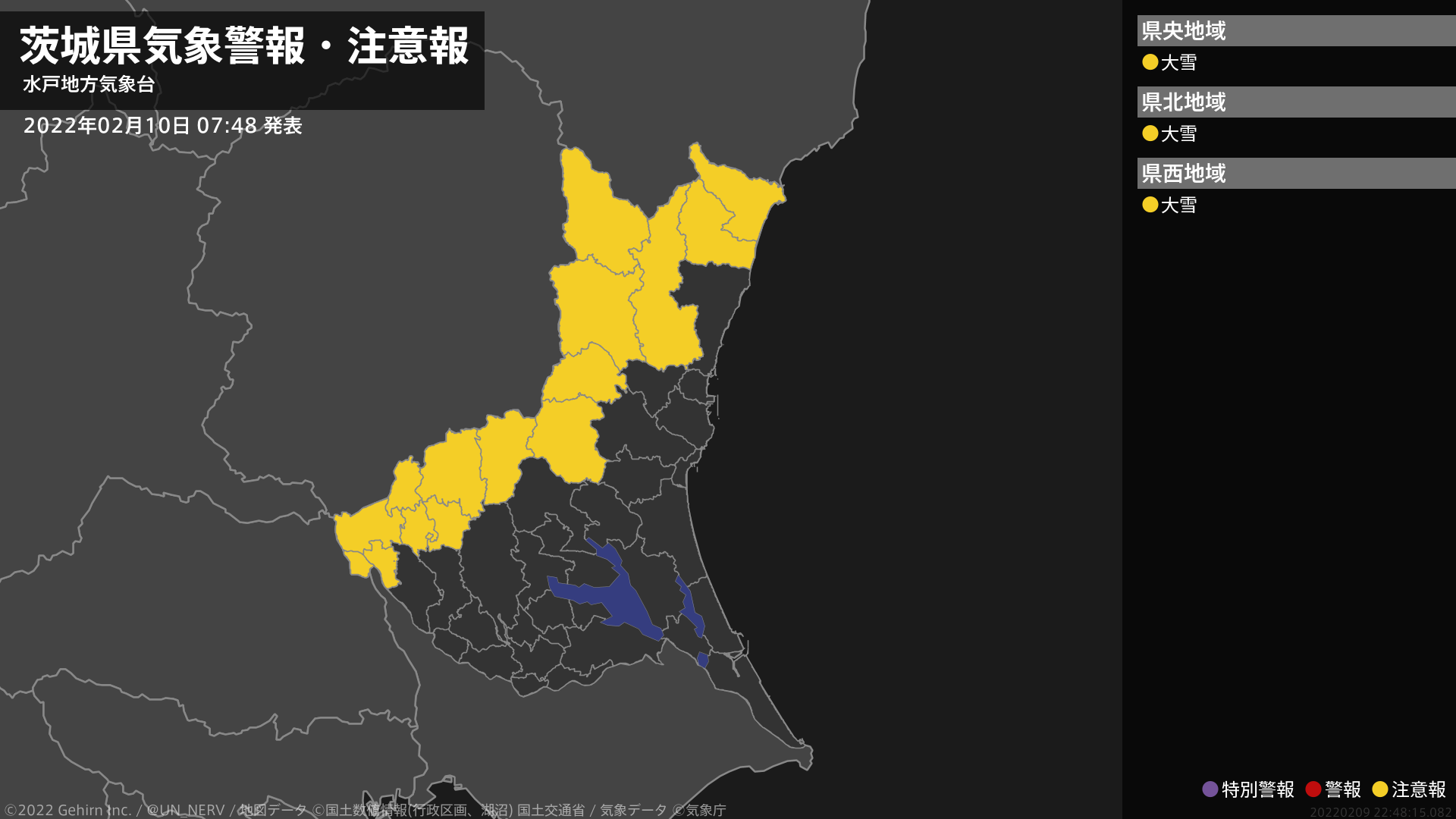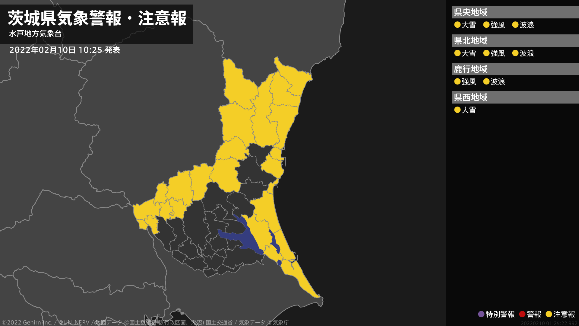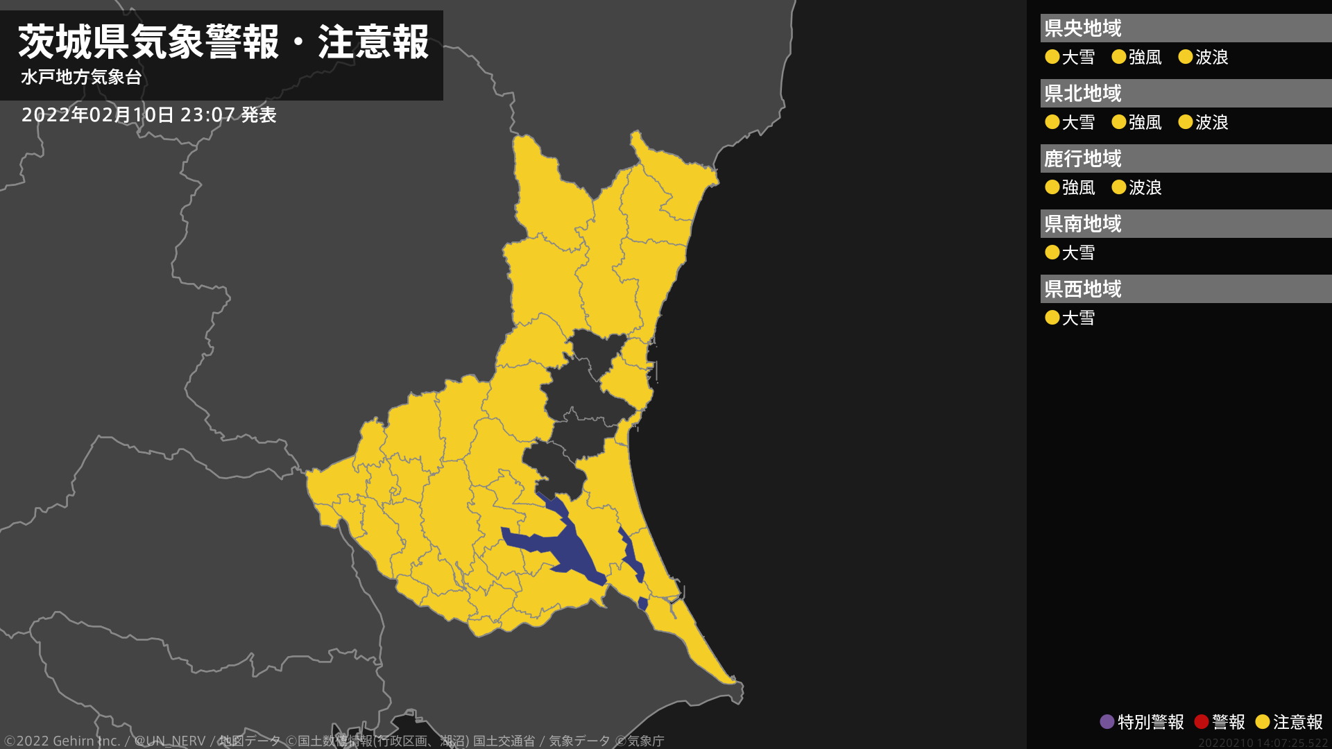 【茨城県 気象警報・注意報 2022年02月10日 23:07】茨城県では、強風や大雪、高波に注意してください。#気象警報注意報 #茨城県