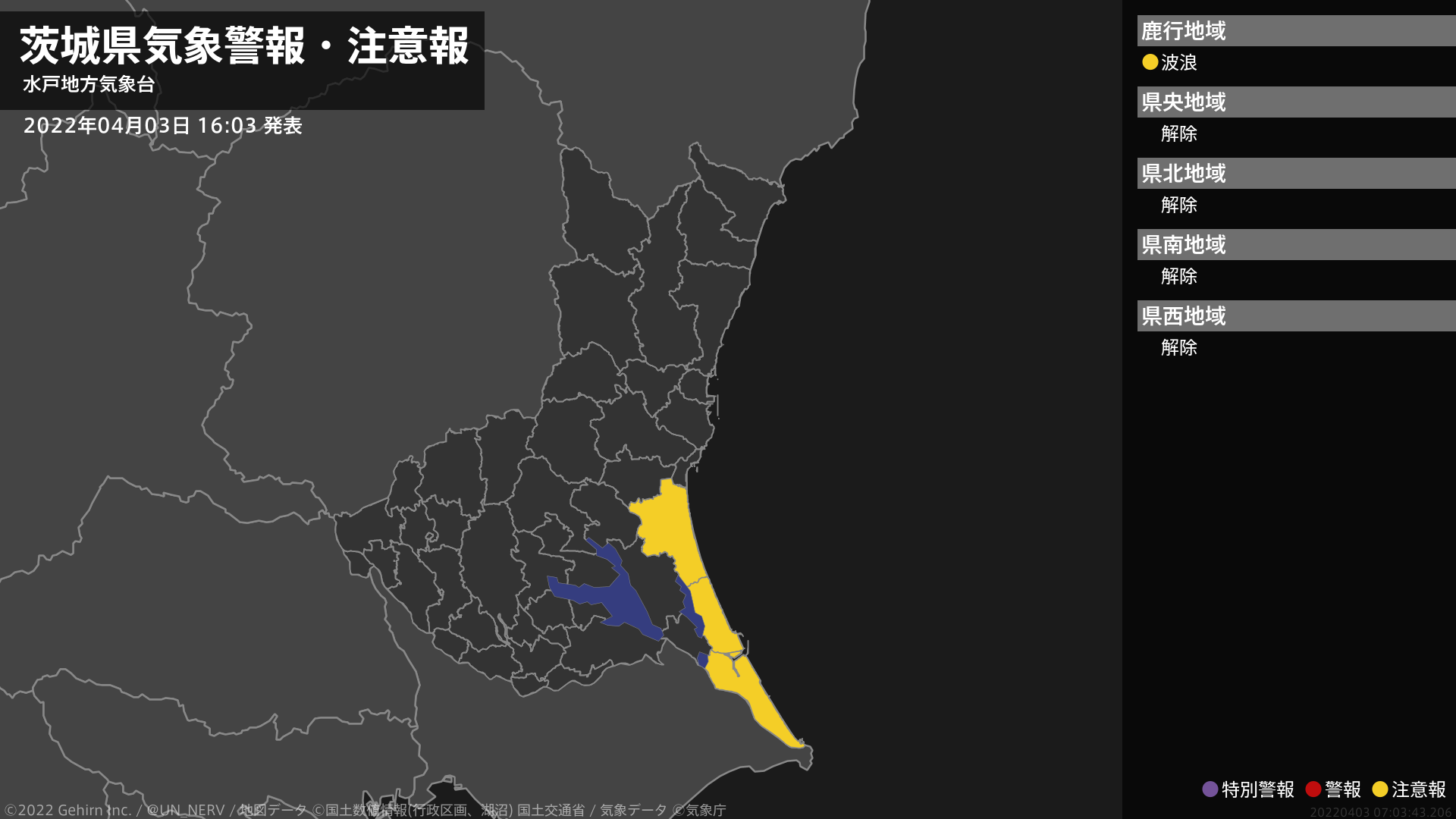 【茨城県 気象警報・注意報 2022年04月03日 16:03】南部では、4日未明から高波に注意してください。#気象警報注意報 #茨城県