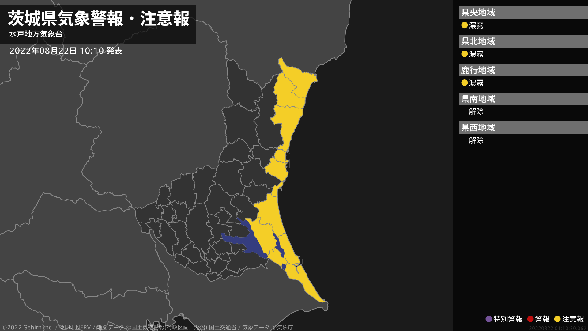 【茨城県 気象警報・注意報 2022年08月22日 10:10】茨城県では、23日昼前まで濃霧による視程障害に注意してください。#気象警報注意報 #茨城県