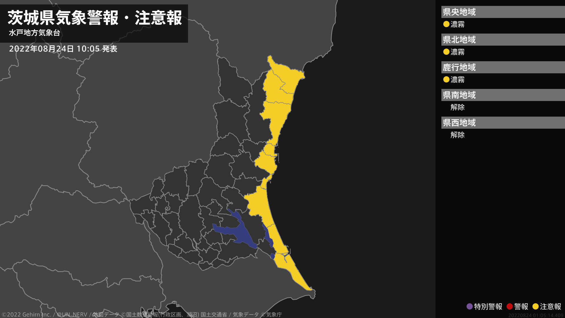 【茨城県 気象警報・注意報 2022年08月24日 10:05】茨城県では、24日夕方まで濃霧による視程障害に注意してください。#気象警報注意報 #茨城県