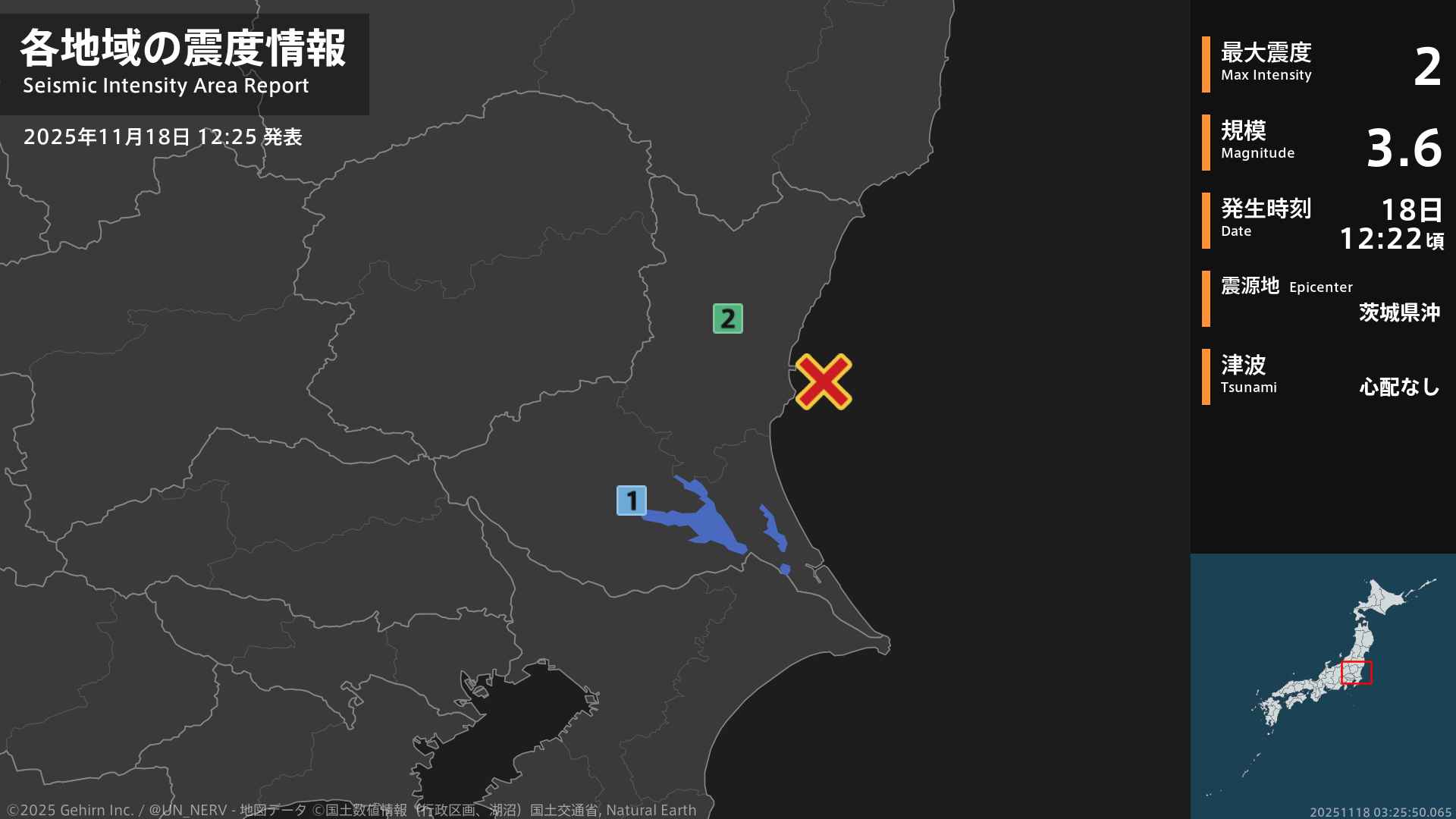 【地震情報 2025年11月18日】12時22分頃、茨城県沖を震源とする地震がありました。震源の深さは約50km、地震の規模はM3.6、最大震度2を茨城県で観測しています。この地震による津波の心配はありません。#地震 #茨城県