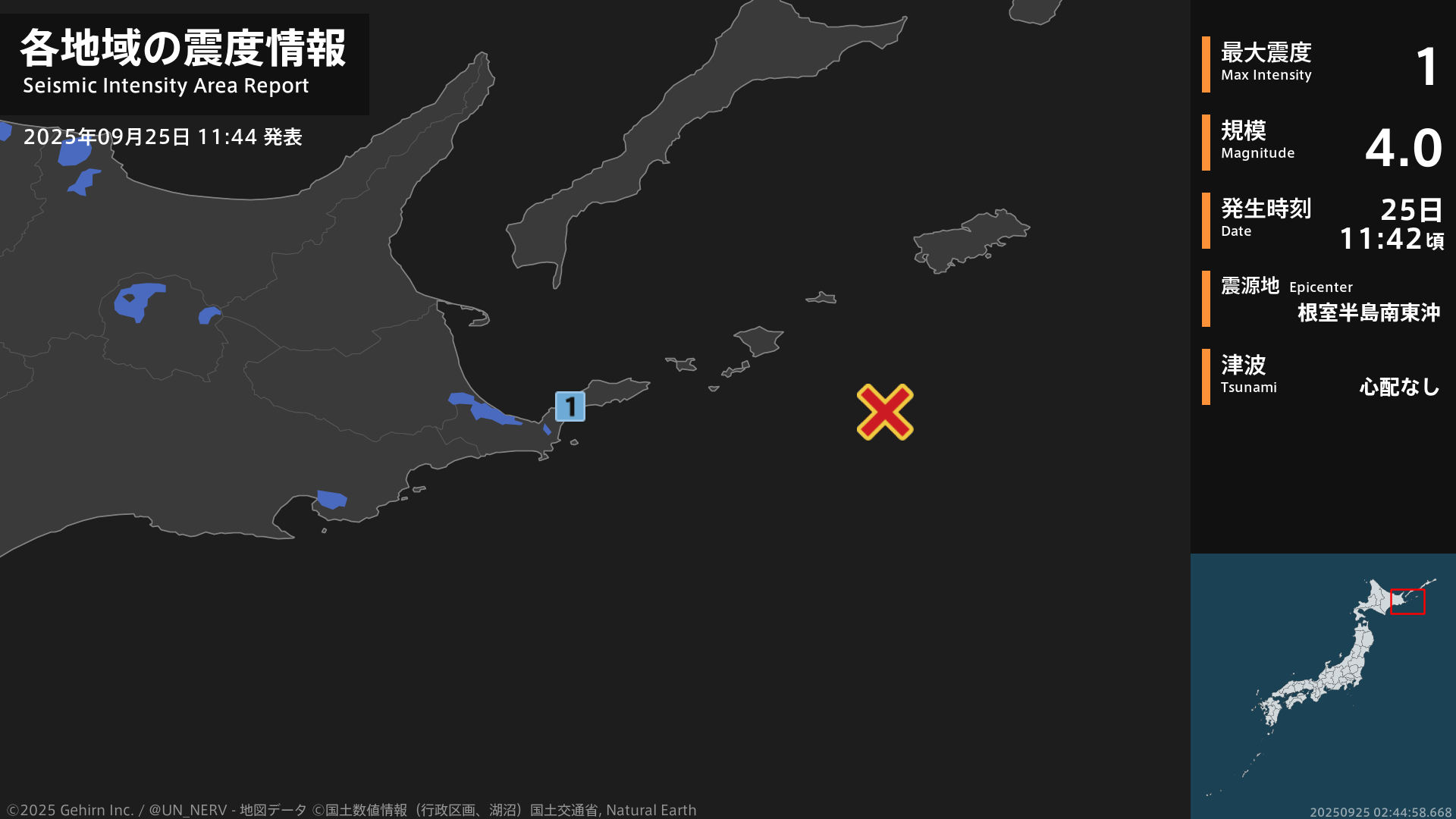 11時42分頃、根室半島南東沖を震源とする地震がありました。震源の深さは約50km、地震の規模はM4.0、最大震度1を北海道で観測しています。この地震による津波の心配はありません。