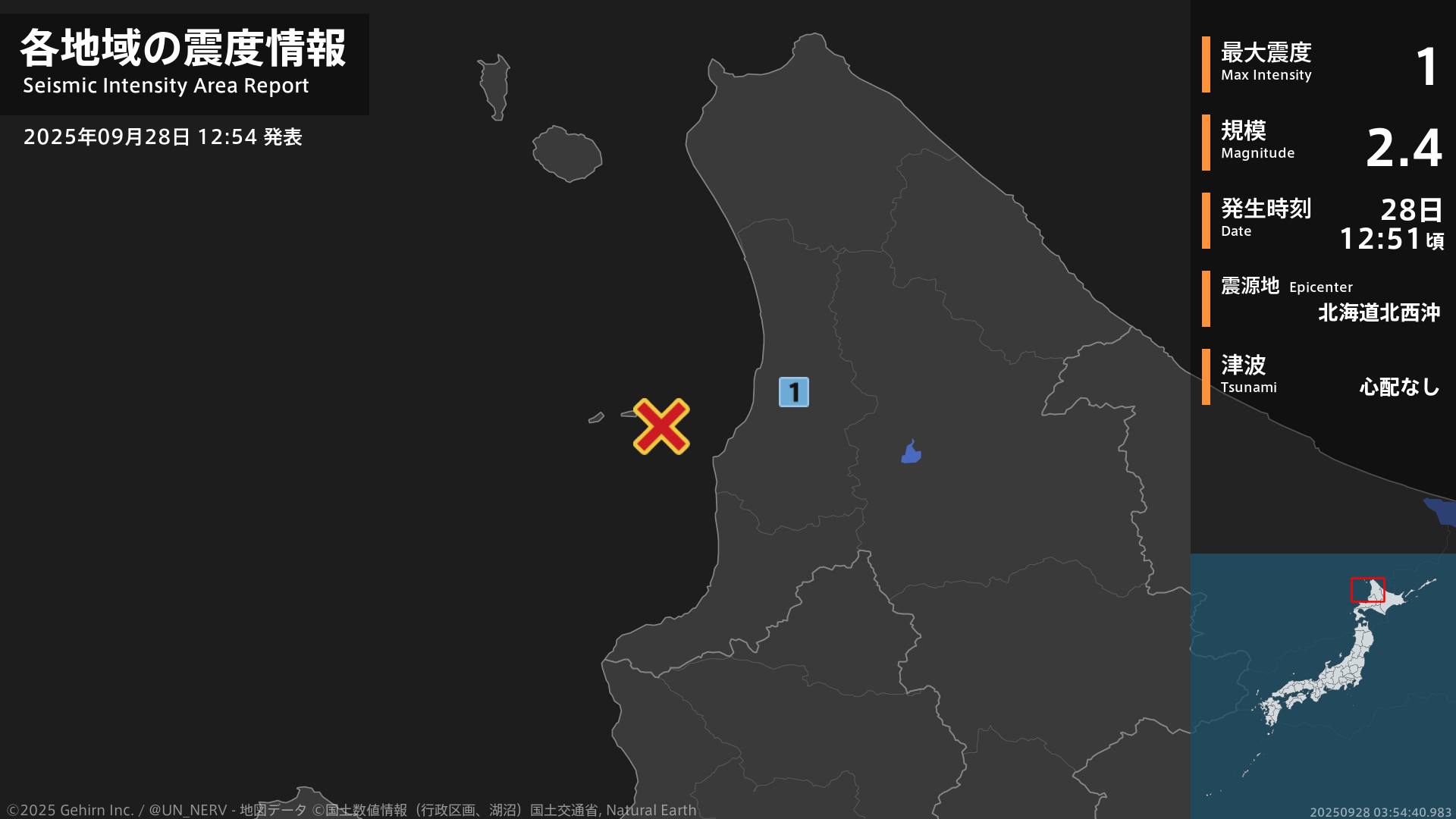 12時51分頃、北海道北西沖を震源とする地震がありました。震源の深さは約10km、地震の規模はM2.4、最大震度1を北海道で観測しています。この地震による津波の心配はありません。