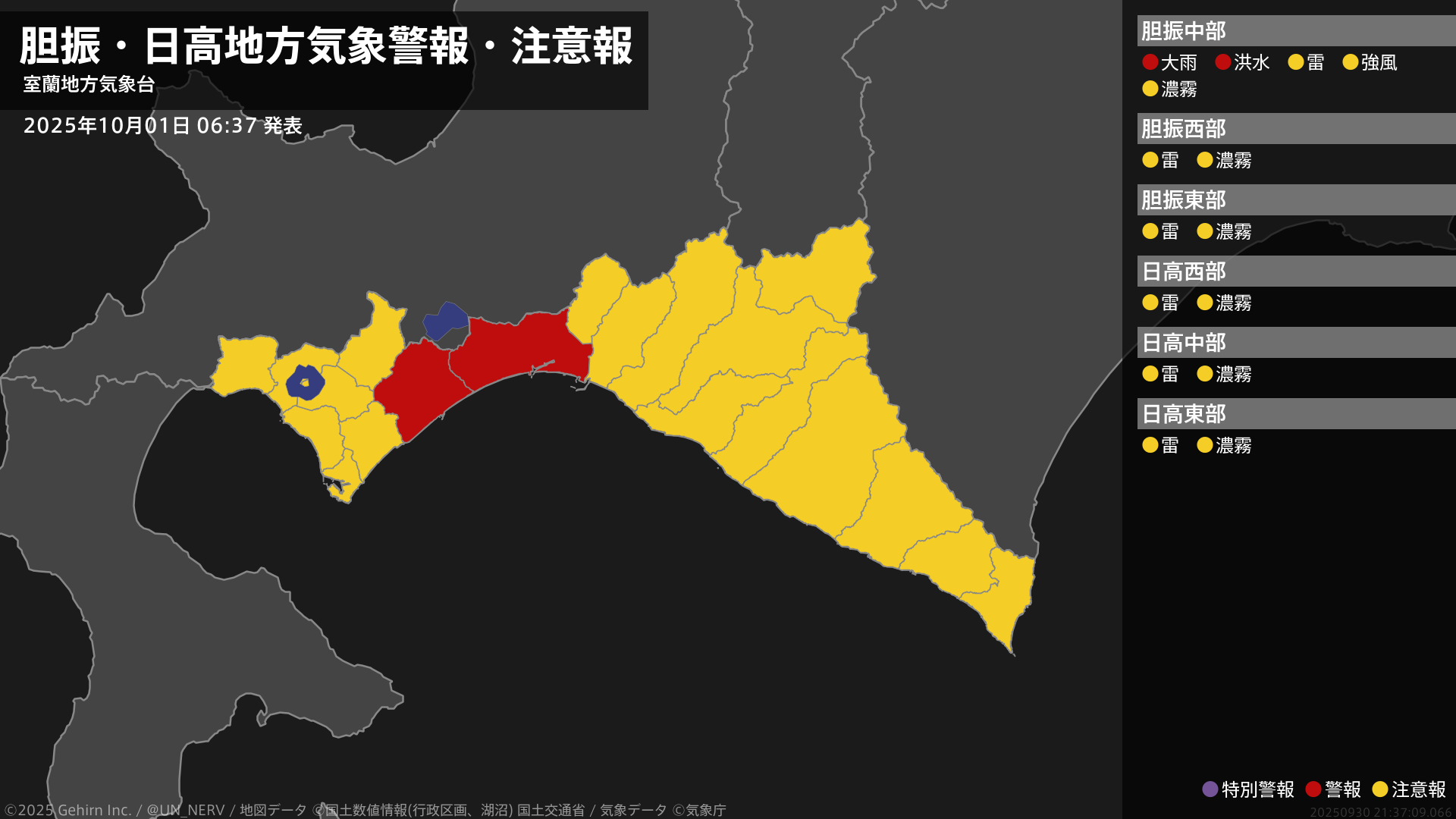 【胆振・日高地方 記録的短時間大雨情報 2025年10月01日 06:35】