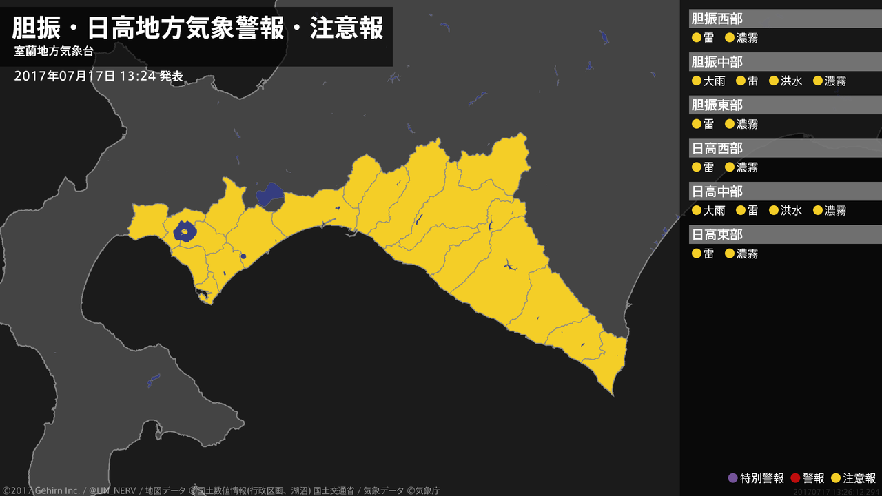 【胆振・日高地方 気象警報・注意報 2017年07月17日 13:26】
