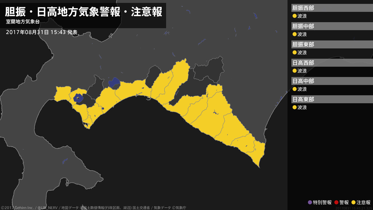 【胆振・日高地方 気象警報・注意報 2017年08月31日 15:45】