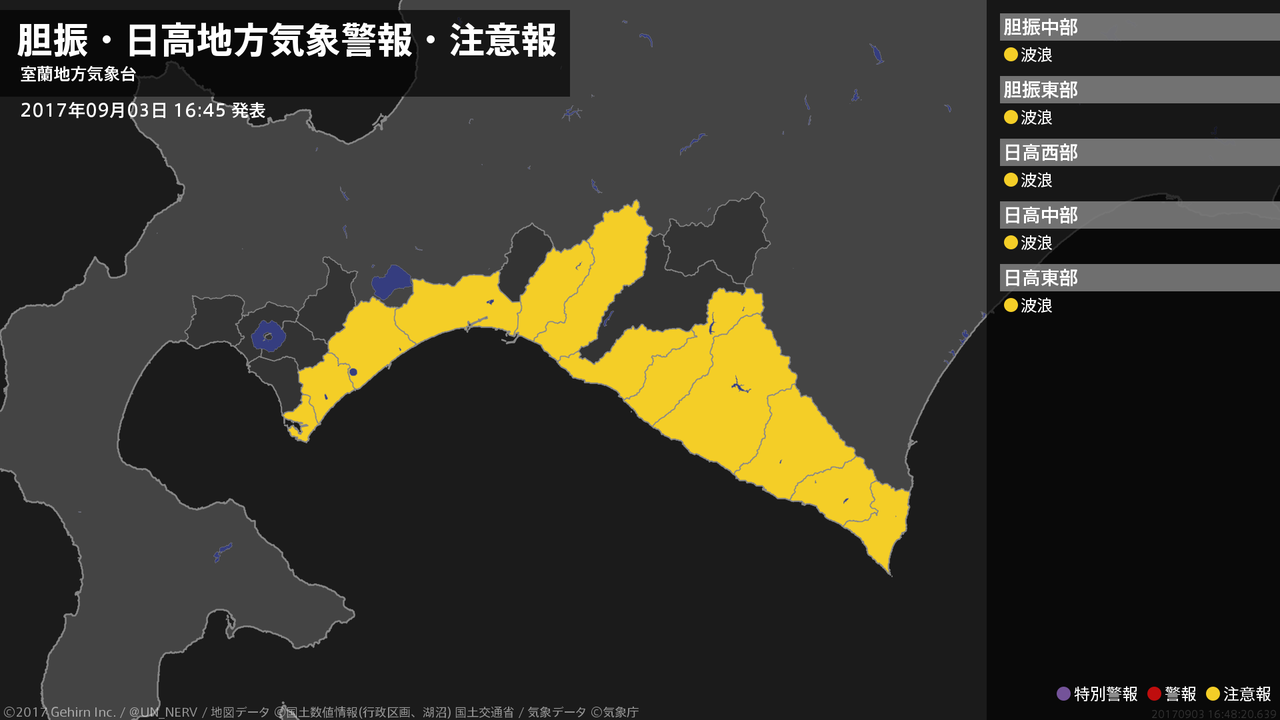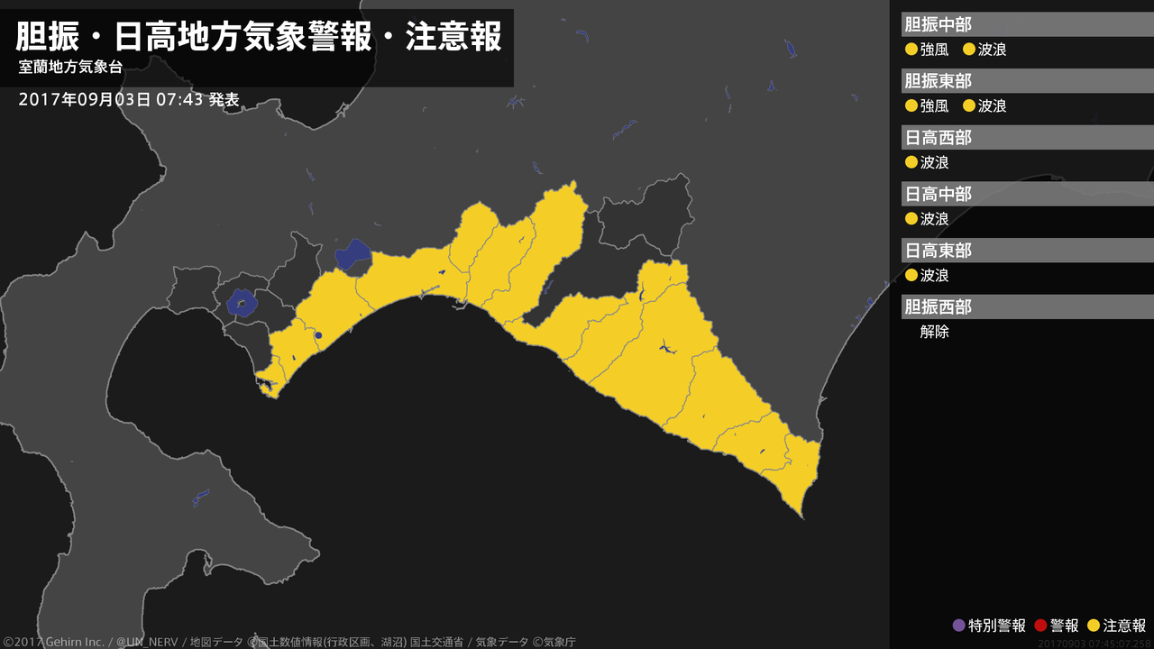 【胆振・日高地方 気象警報・注意報 2017年09月03日 07:45】