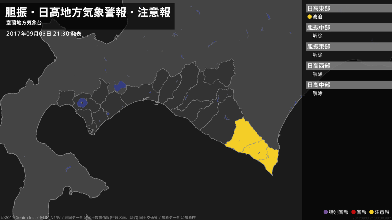 【胆振・日高地方 気象警報・注意報 2017年09月03日 21:33】