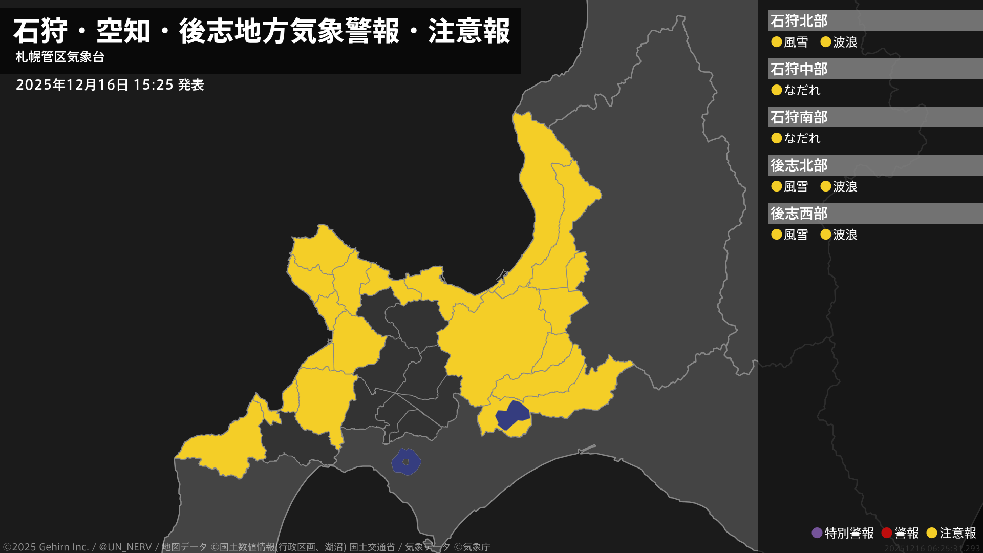 【石狩・空知・後志地方 気象警報・注意報 2025年12月16日 15:25】石狩、後志地方では、風雪や高波に注意してください。石狩地方では、なだれに注意してください。#気象警報注意報 #石狩地方 #後志地方