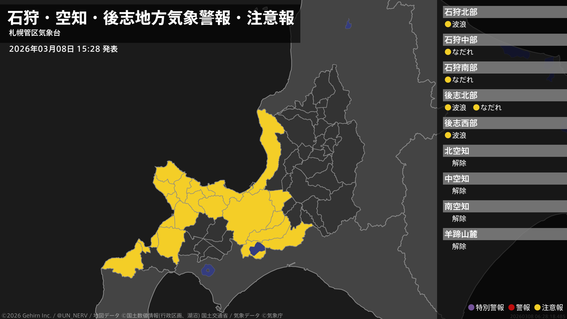 【石狩・空知・後志地方 気象警報・注意報 2026年03月08日 15:28】石狩、後志地方では、8日夜のはじめ頃まで高波に、9日までなだれに注意してください。#気象警報注意報 #石狩地方 #空知地方 #後志地方
