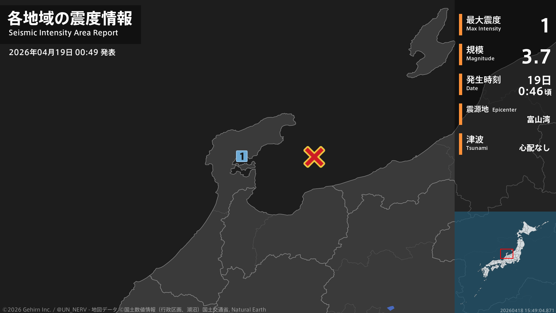 【地震情報 2026年4月19日】0時46分頃、富山湾を震源とする地震がありました。震源の深さは約20km、地震の規模はM3.7、最大震度1を石川県で観測しています。この地震による津波の心配はありません。#地震 #石川県