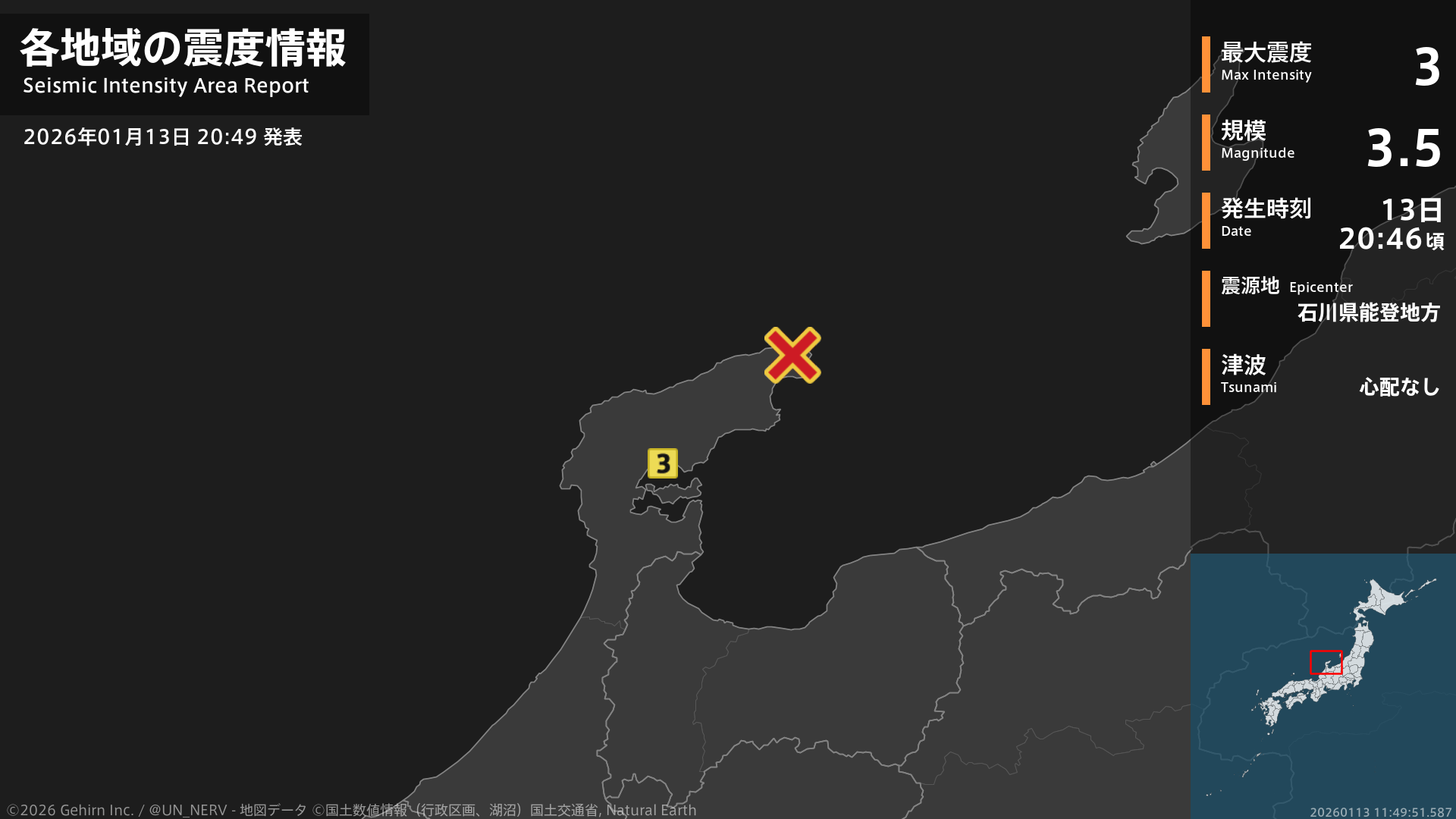 【地震情報 2026年1月13日】20時46分頃、石川県能登地方を震源とする地震がありました。震源の深さは約10km、地震の規模はM3.5、最大震度3を石川県で観測しています。この地震による津波の心配はありません。#地震 #石川県