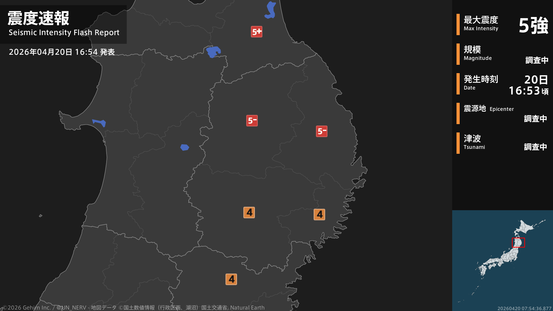 [震度5弱]岩手沿岸北部、岩手内陸北部、岩手内陸南部、宮城北部