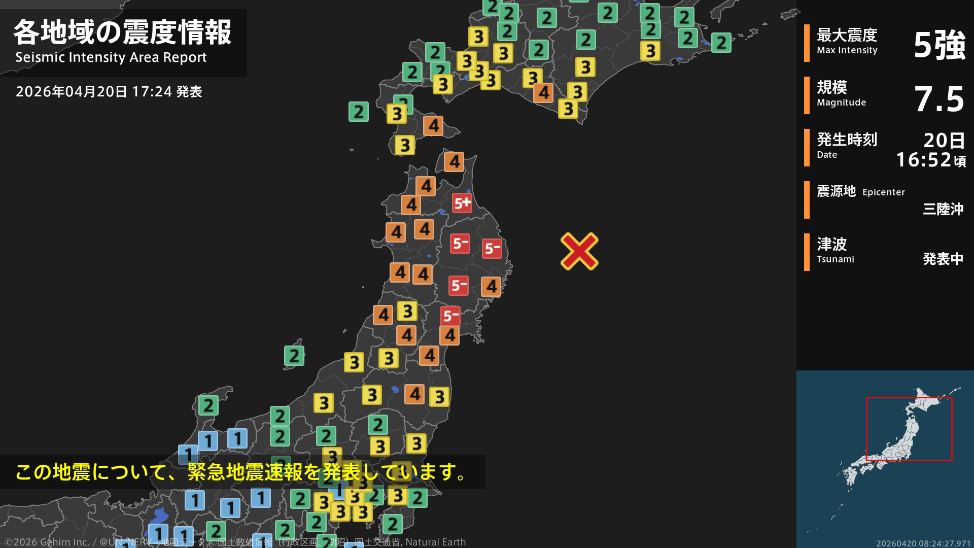 16時52分頃、三陸沖を震源とする地震がありました。震源の深さは約10km、地震の規模はM7.5、最大震度5強を青森県で観測しています。津波警報を発表中です。