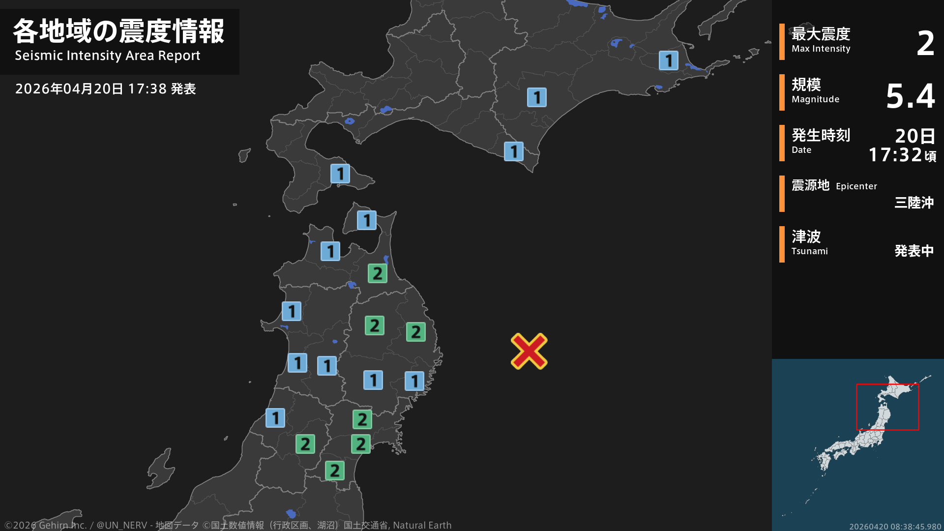 17時32分頃、三陸沖を震源とする地震がありました。震源の深さは約10km、地震の規模はM5.4、最大震度2を青森県、岩手県、宮城県、山形県で観測しています。津波警報を発表中です。