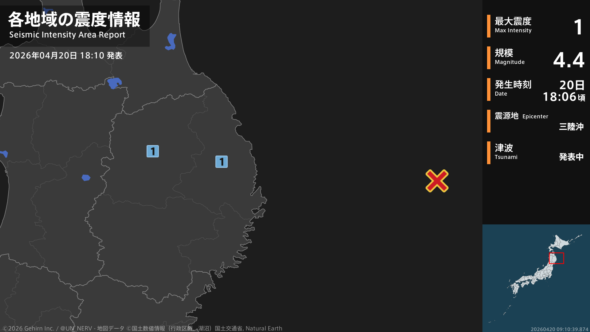 18時6分頃、三陸沖を震源とする地震がありました。震源の深さは約10km、地震の規模はM4.4、最大震度1を岩手県で観測しています。津波警報を発表中です。