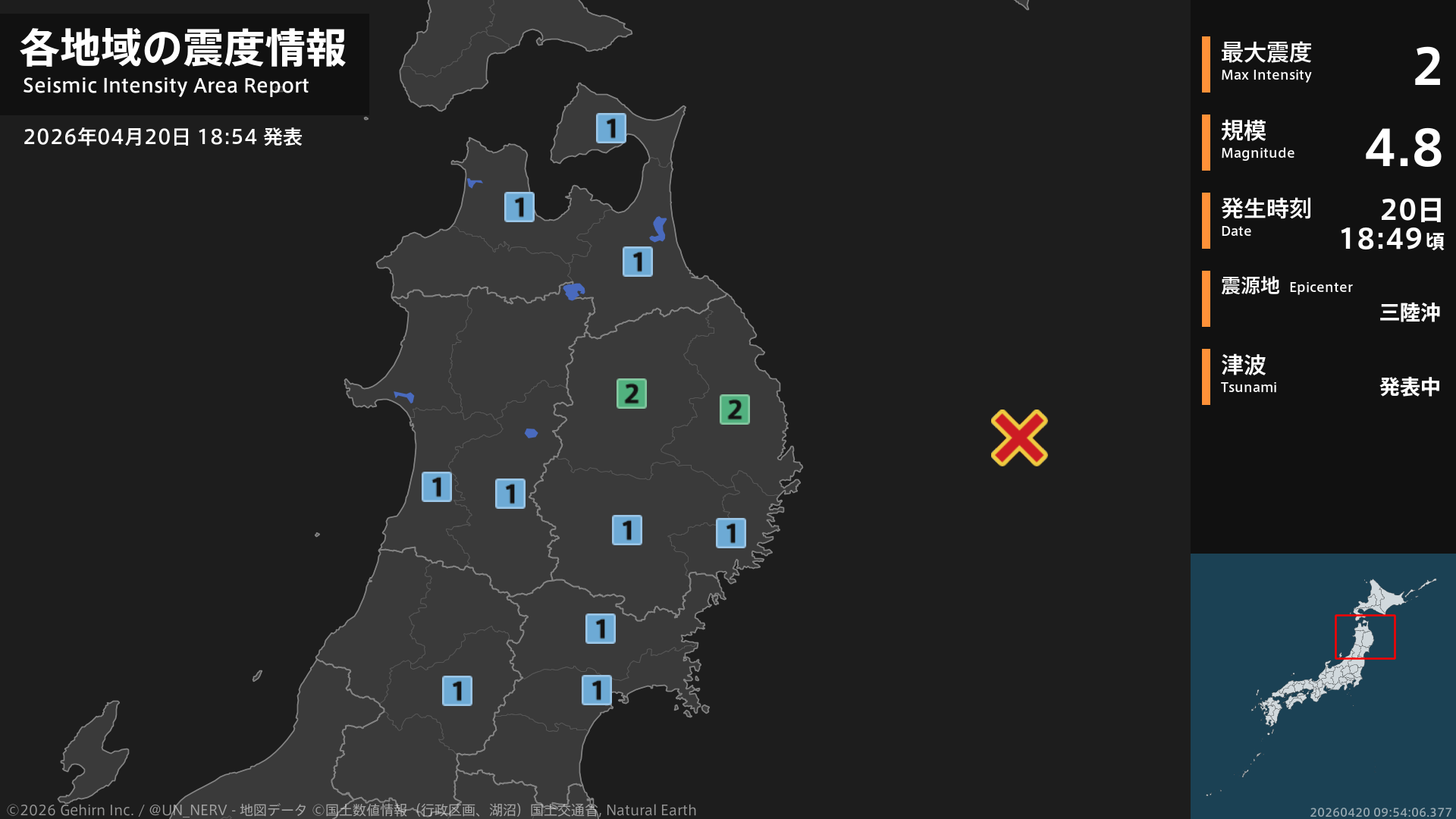 18時49分頃、三陸沖を震源とする地震がありました。震源の深さは約10km、地震の規模はM4.8、最大震度2を岩手県で観測しています。津波警報を発表中です。