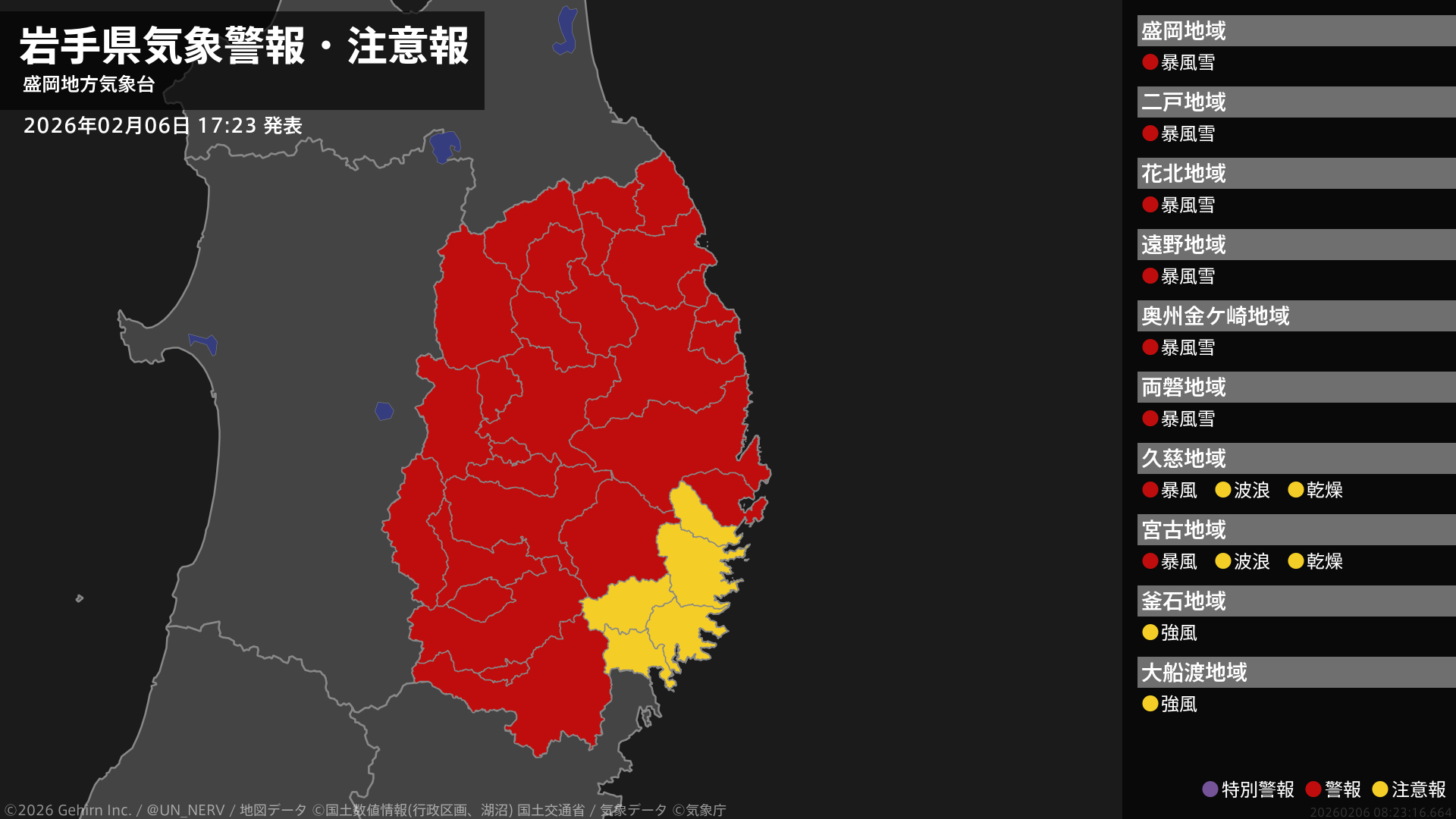 【岩手県 気象警報・注意報 2026年02月06日 17:23】