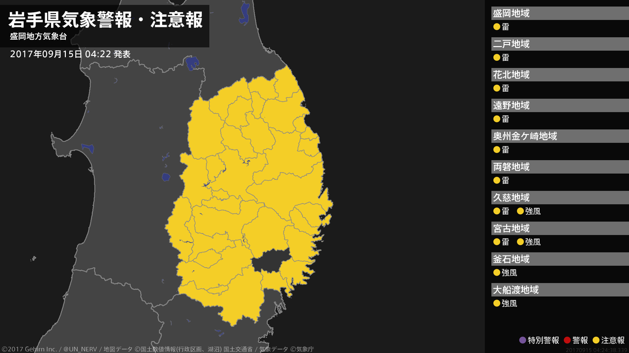 【岩手県 気象警報・注意報 2017年09月15日 04:24】