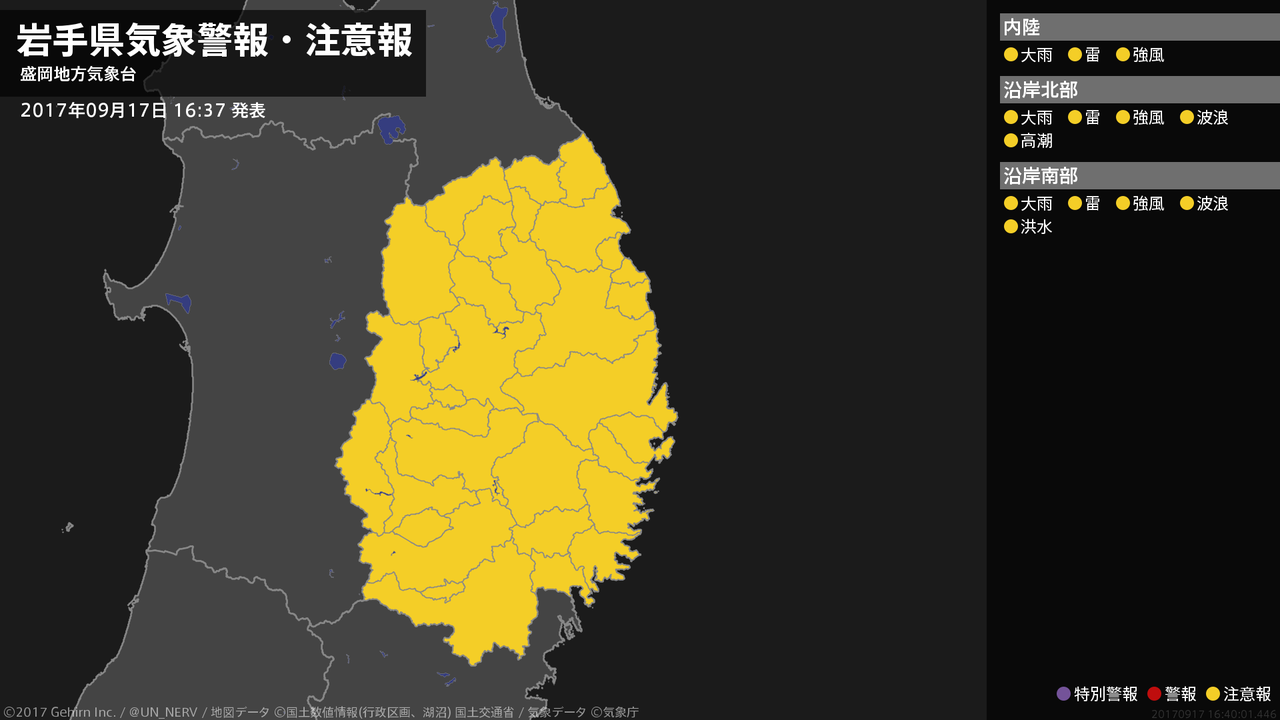 【岩手県 気象警報・注意報 2017年09月16日 03:35】