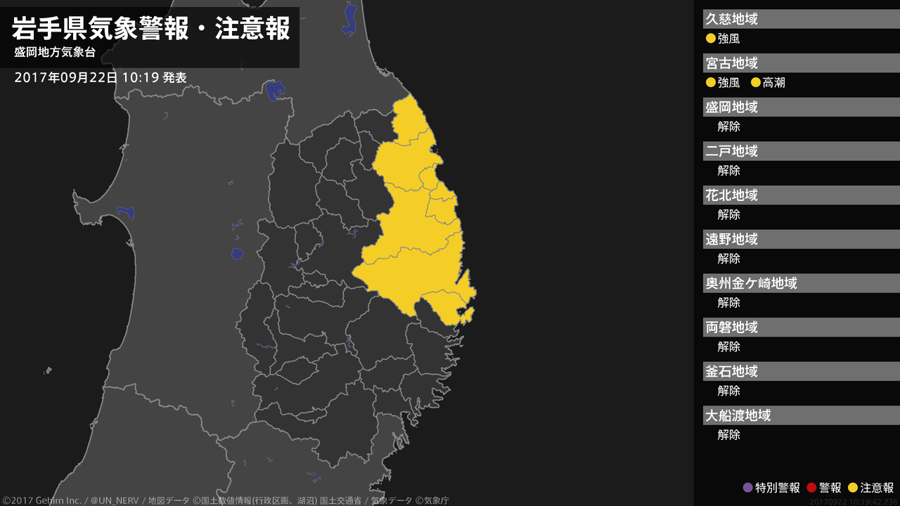 【岩手県 気象警報・注意報 2017年09月22日 19:15】沿岸北部、沿岸南部では、強風に注意してください。沿岸北部では、高潮に注意してください。#気象警報注意報 #岩手県