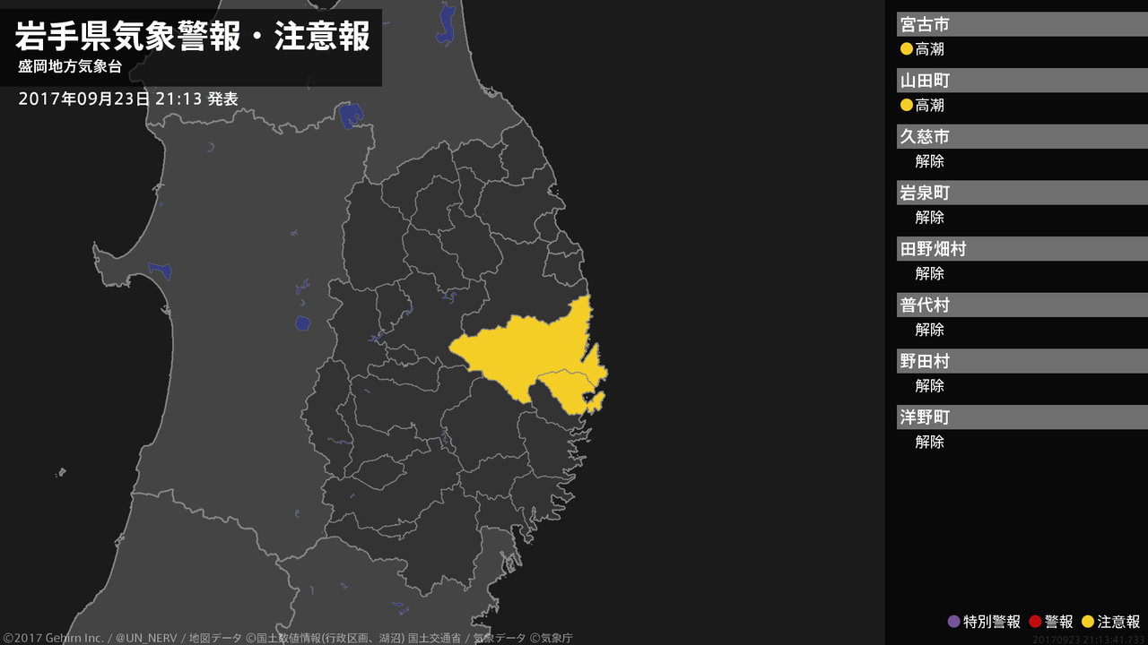 【岩手県 気象警報・注意報 2017年09月23日 21:13】沿岸北部では、25日まで高潮に注意してください。#気象警報注意報 #岩手県