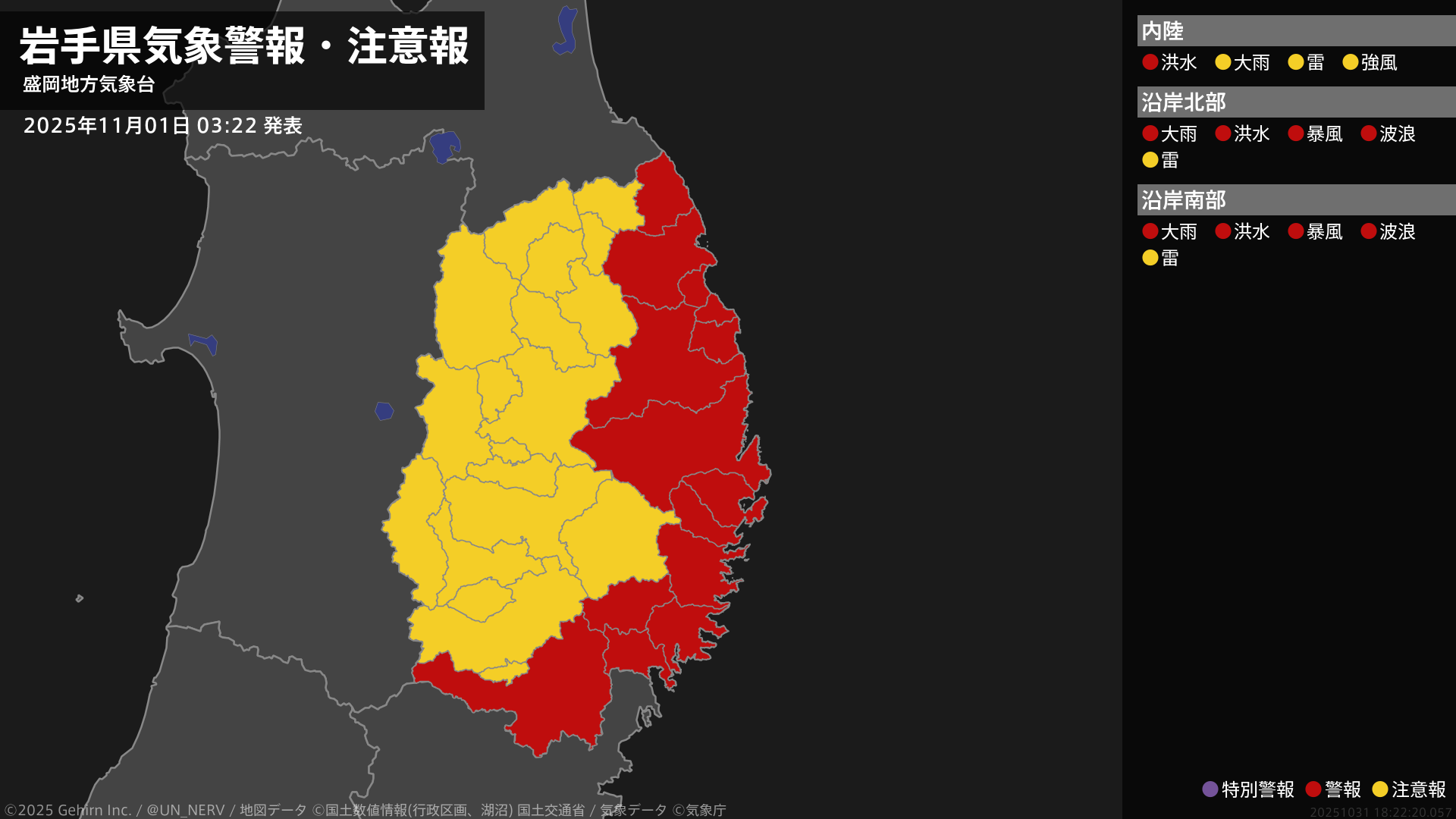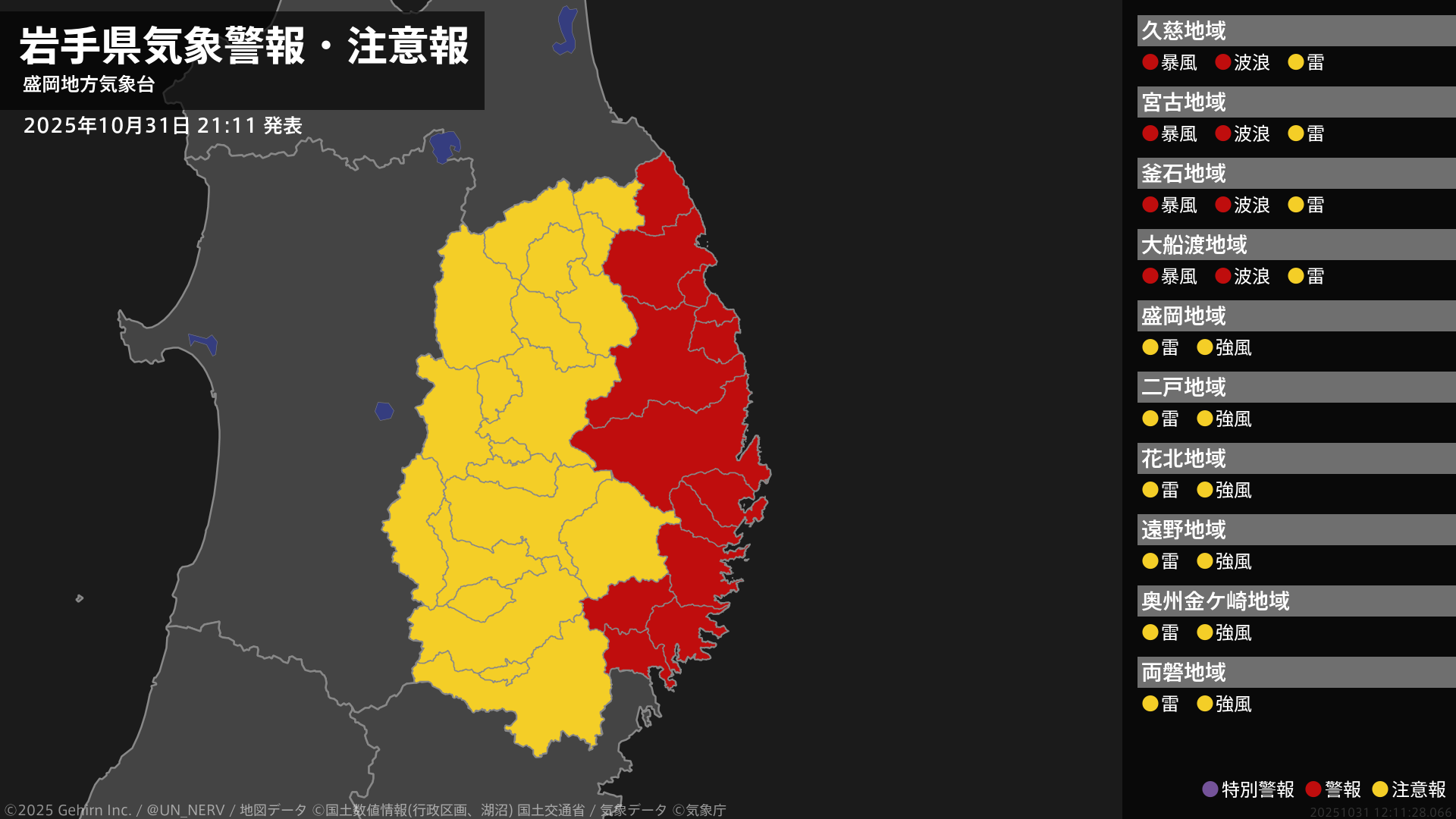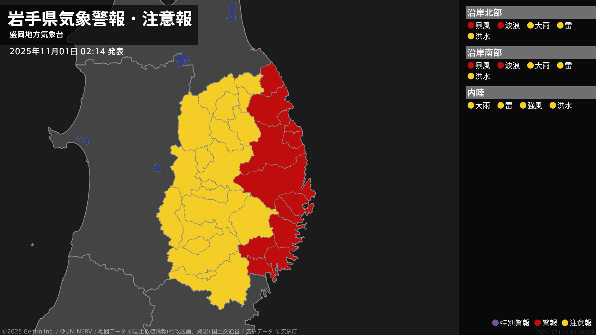 北日本では11月1日は暴風や高波に警戒し、北海道地方では高潮による低い土地の浸水に、東日本では高波に注意・警戒してください。また、東日本と北日本では1日にかけて、土砂災害、低い土地の浸水、河川の増水に注意・警戒し、全国的に落雷や竜巻などの激しい突風、降ひょうに注意してください。