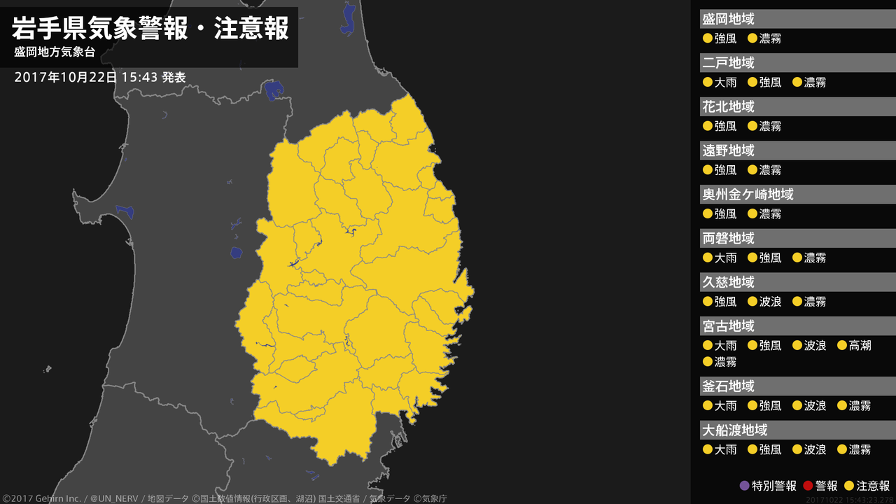 【岩手県 気象警報・注意報 2017年10月22日 17:21】岩手県では、土砂災害や強風、高波、高潮、濃霧による視程障害に注意してください。#気象警報注意報 #岩手県