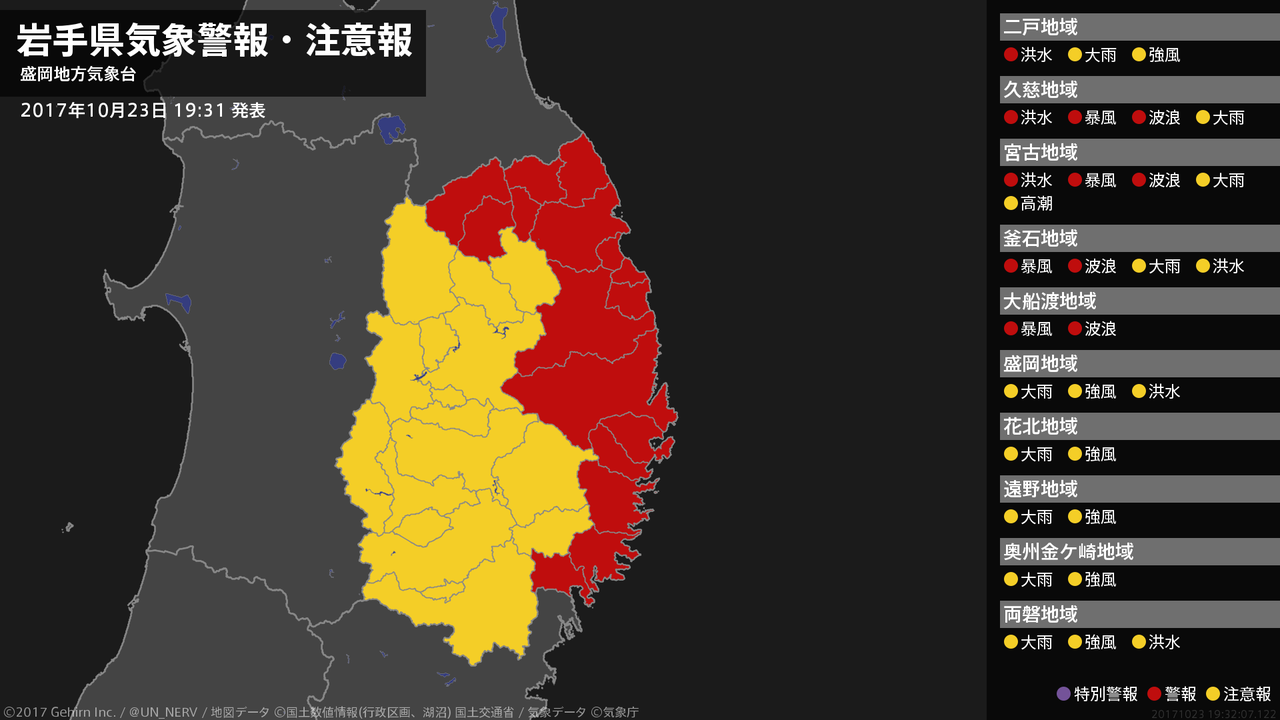 【岩手県 気象警報 2017年10月23日 19:32】内陸、沿岸北部では、23日夜遅くまで河川の増水に警戒してください。沿岸北部、沿岸南部では、23日夜のはじめ頃まで暴風に、24日明け方まで高波に警戒してください。#気象警報 #気象警報注意報 #岩手県