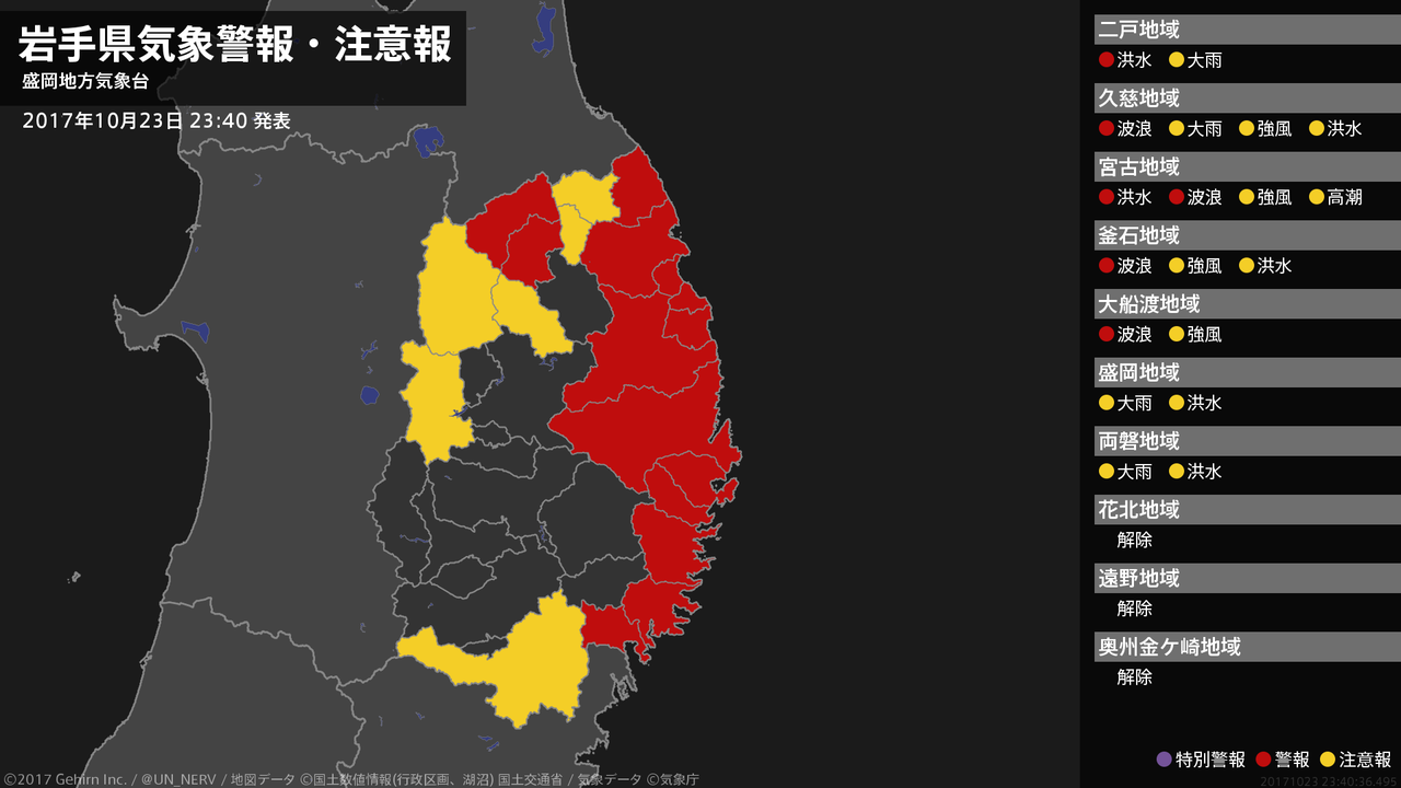 【岩手県 気象警報 2017年10月23日 23:40】内陸、沿岸北部では、24日明け方まで河川の増水に警戒してください。沿岸北部、沿岸南部では、24日明け方まで高波に警戒してください。#気象警報 #気象警報注意報 #岩手県