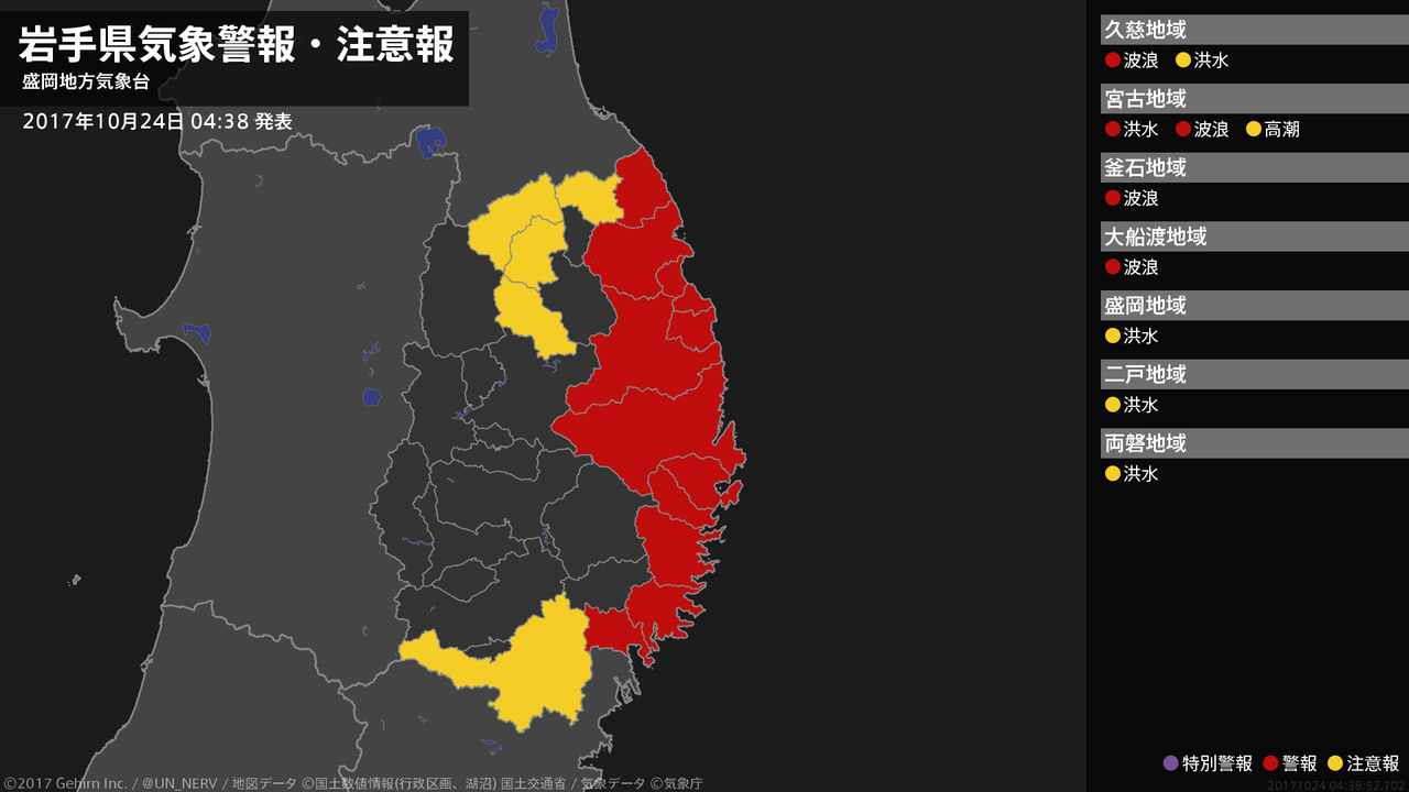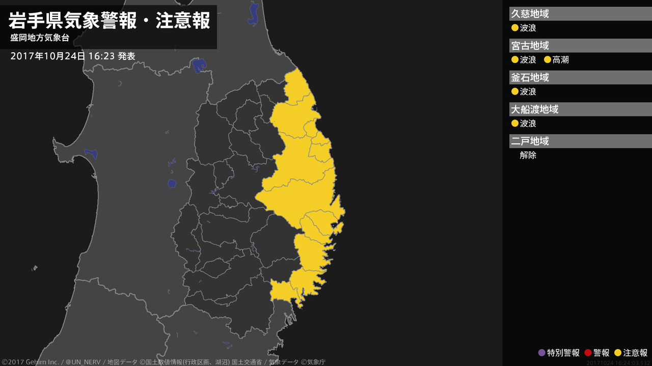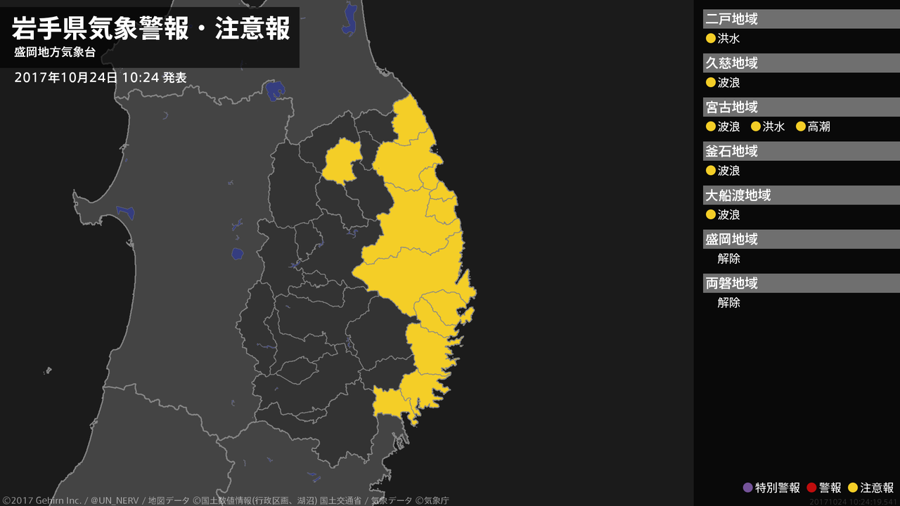 【岩手県 気象警報 2017年10月24日 02:44】沿岸北部では、24日昼前まで河川の増水に警戒してください。沿岸北部、沿岸南部では、24日明け方まで高波に警戒してください。#気象警報 #気象警報注意報 #岩手県