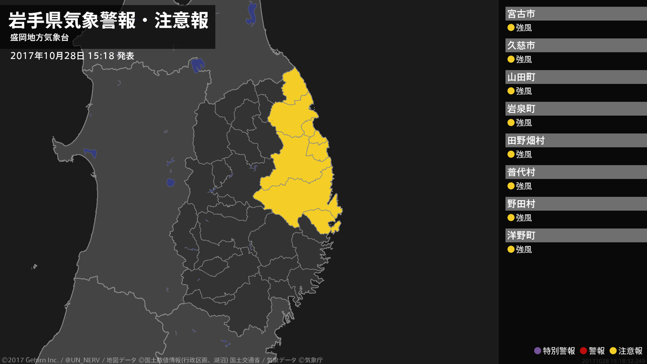 【岩手県 気象警報・注意報 2017年10月28日 15:18】沿岸北部では、28日夜のはじめ頃まで強風に注意してください。#気象警報注意報 #岩手県