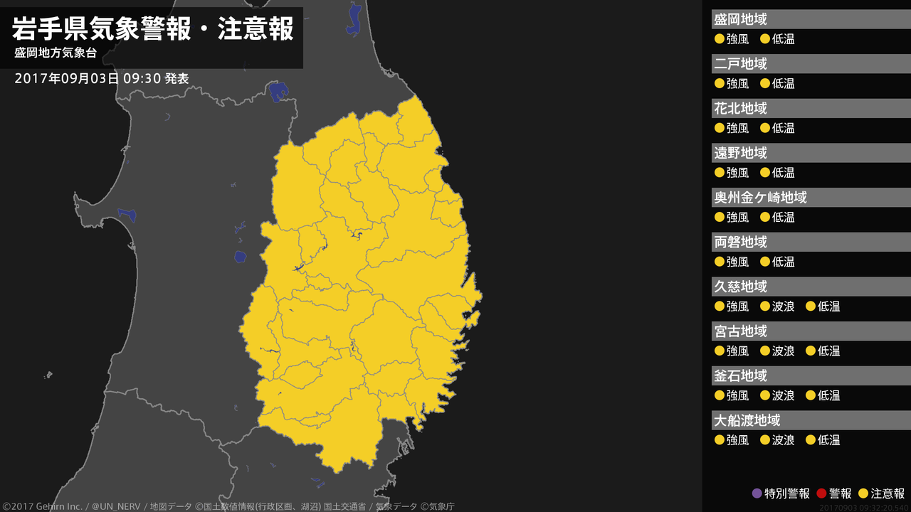 【岩手県 気象警報・注意報 2017年09月01日 09:57】岩手県では、強風や高波、低温に注意してください。#気象警報注意報 #岩手県