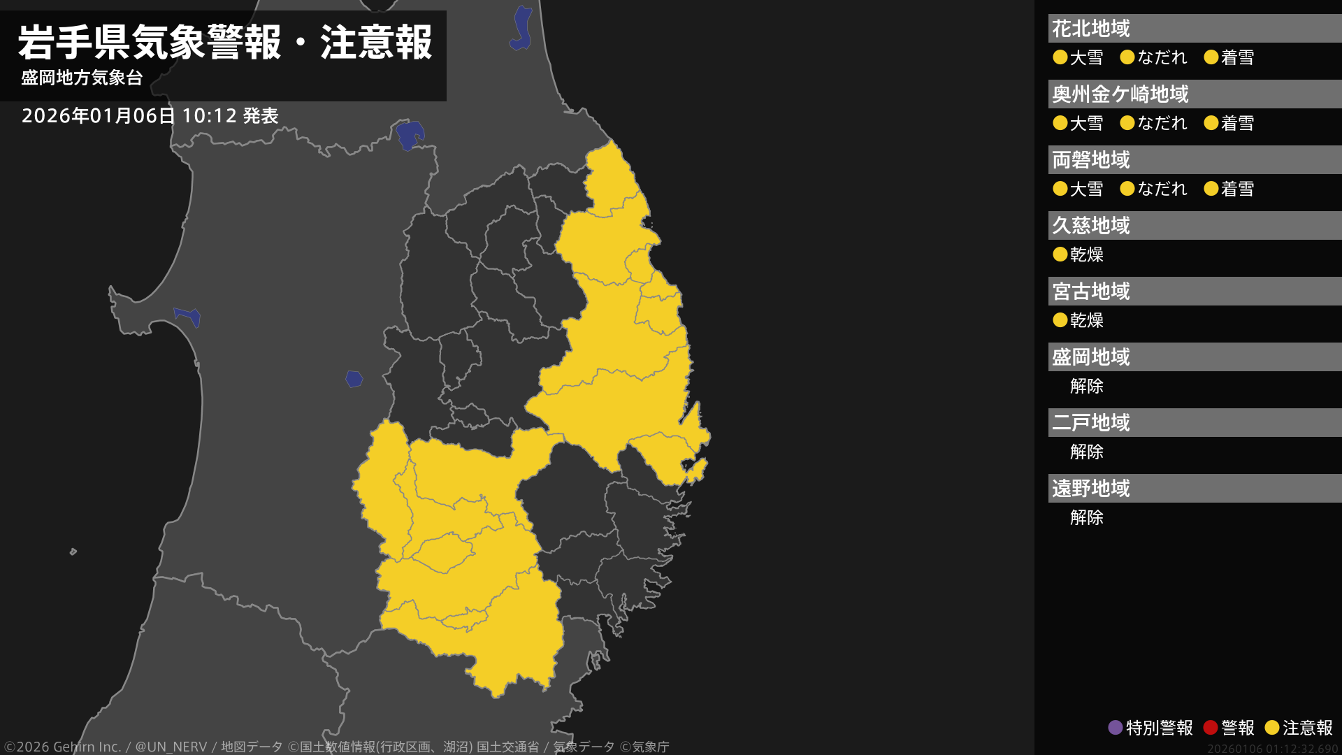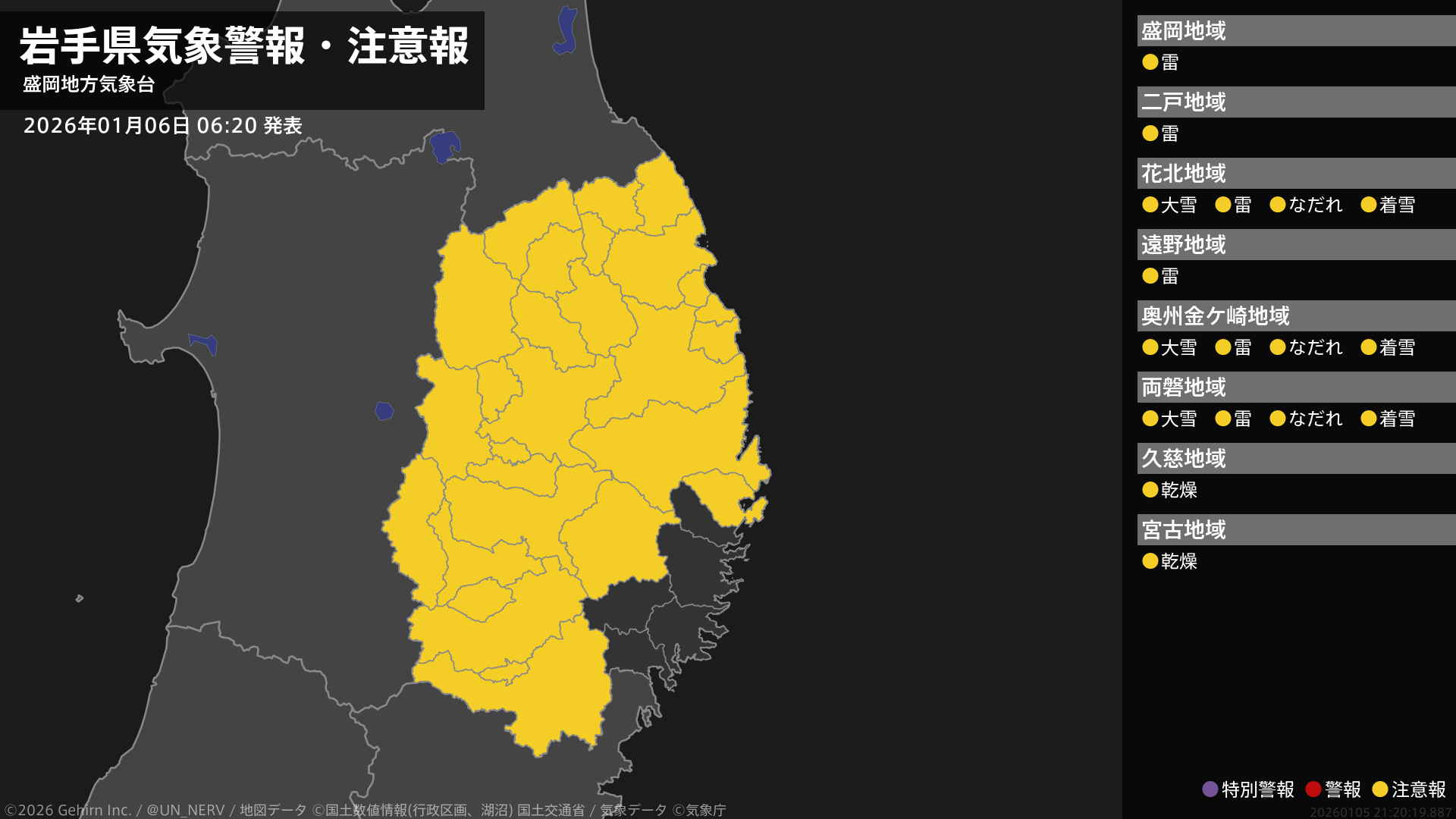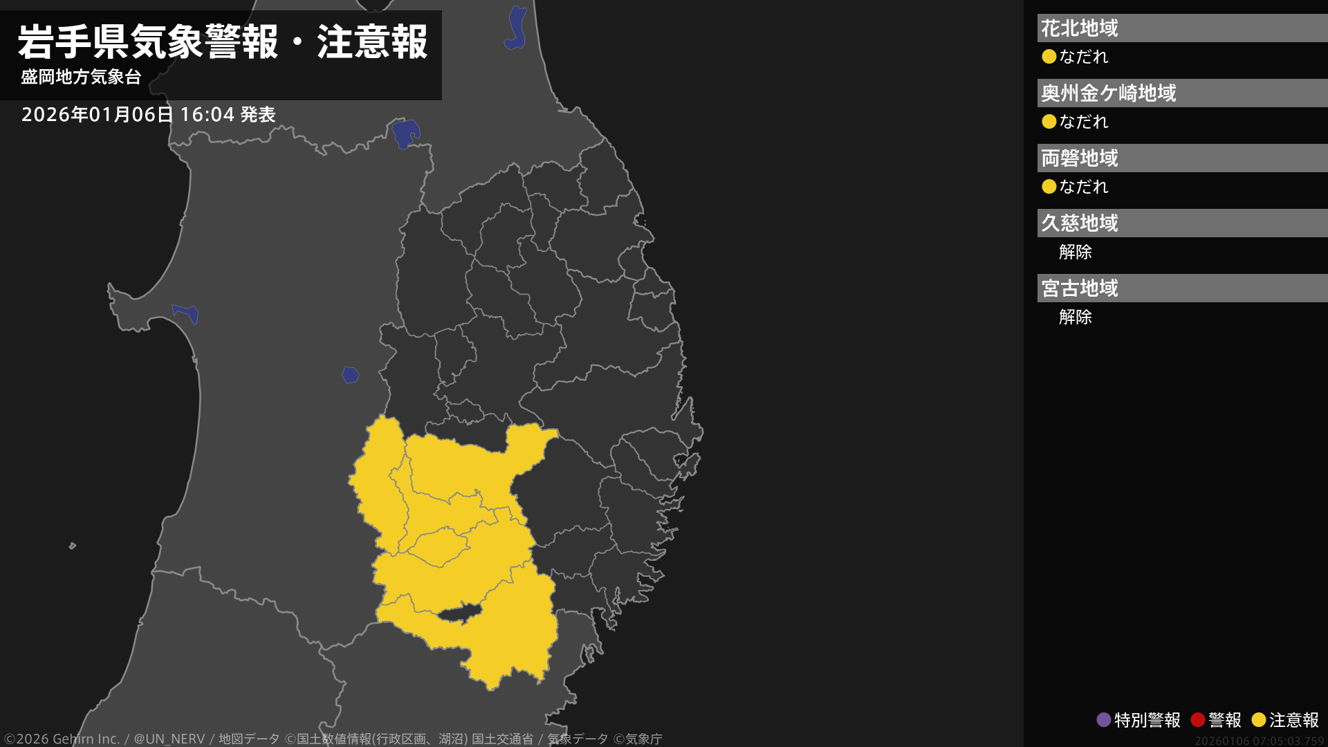 【岩手県 気象警報・注意報 2026年01月06日 16:05】内陸では、7日までなだれに注意してください。#気象警報注意報 #岩手県
