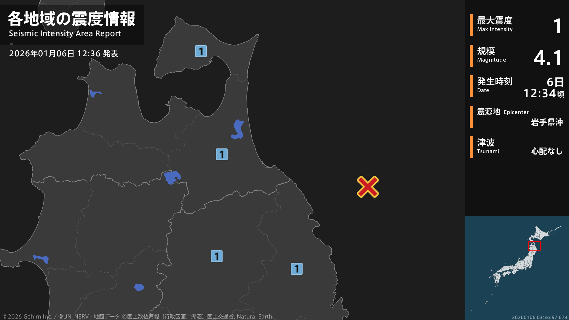 【地震情報 2026年1月6日】12時34分頃、岩手県沖を震源とする地震がありました。震源の深さは約50km、地震の規模はM4.1、最大震度1を青森県、岩手県で観測しています。この地震による津波の心配はありません。#地震 #青森県 #岩手県