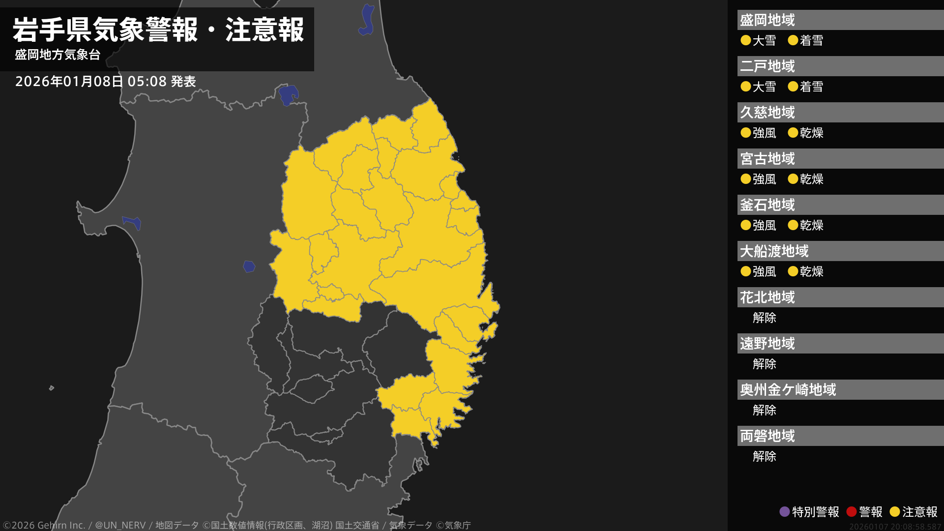 【岩手県 気象警報・注意報 2026年01月07日 04:08】注意報を解除します。#気象警報注意報 #岩手県