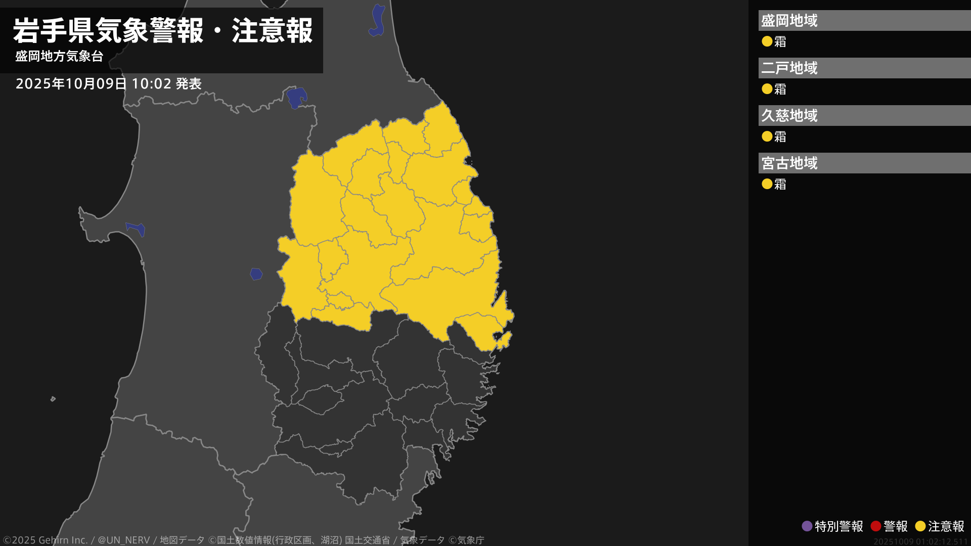 【岩手県 気象警報・注意報 2025年10月09日 10:02】