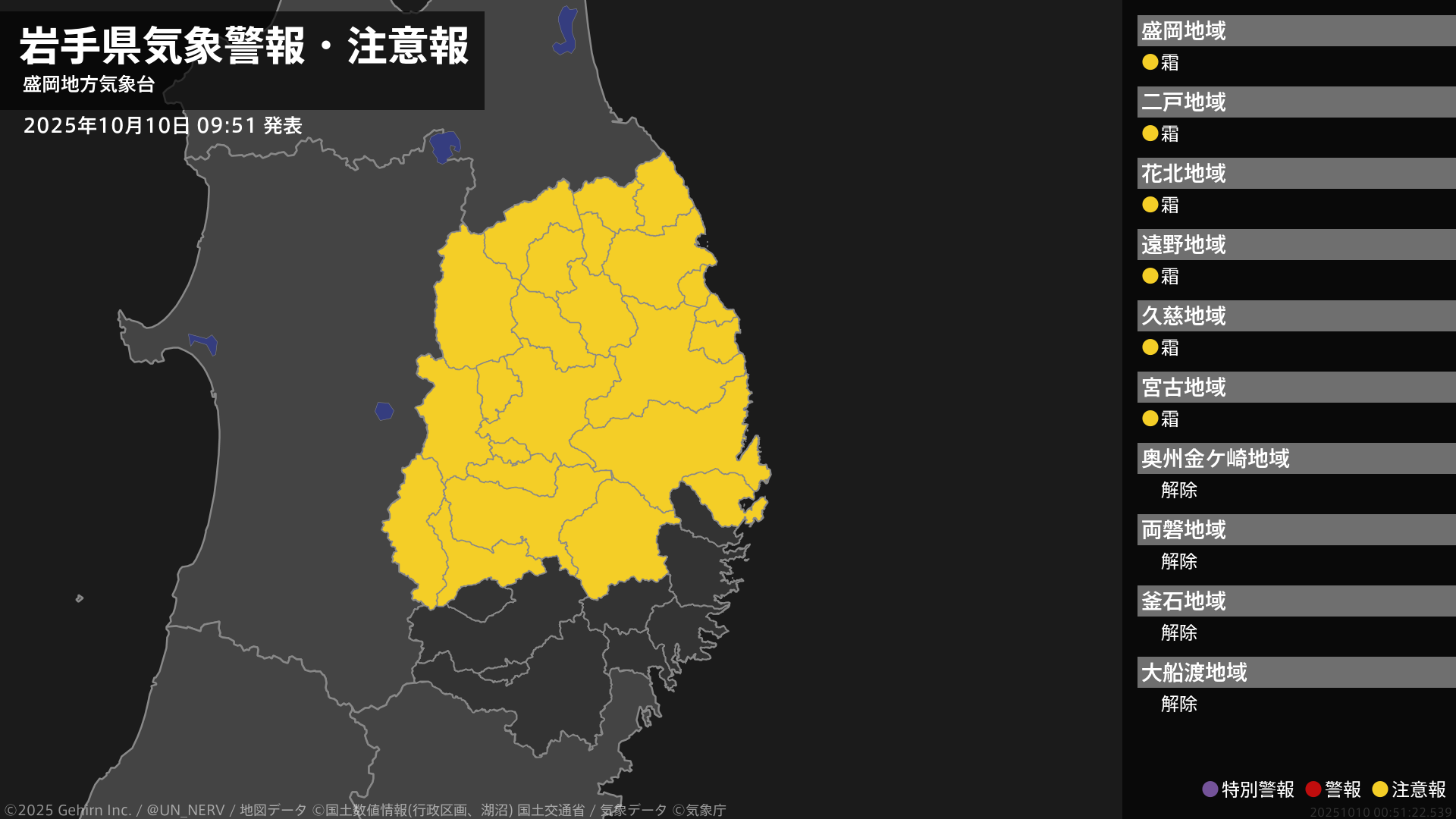 【岩手県 気象警報・注意報 2025年10月10日 09:51】