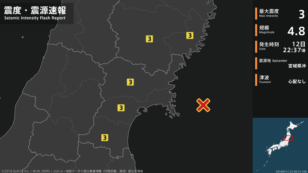 【地震情報 2018年4月12日】22時37分頃、宮城県沖を震源とする地震がありました。震源の深さは約60km、地震の規模はM4.8、最大震度3を岩手県、宮城県で観測しています。この地震による津波の心配はありません。#地震 #岩手県 #宮城県 #青森県 #福島県 #秋田県 #山形県 #茨城県