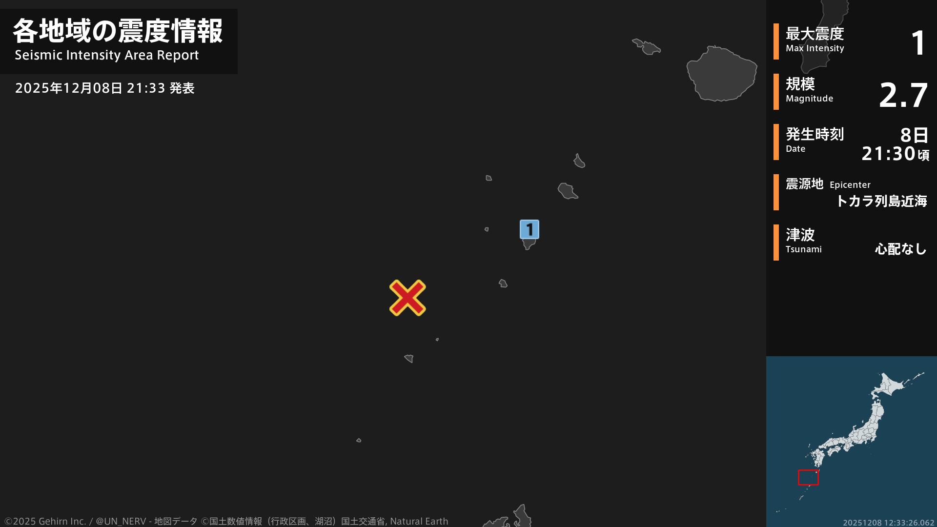 【地震情報 2025年12月8日】21時30分頃、トカラ列島近海を震源とする地震がありました。震源の深さは約10km、地震の規模はM2.7、最大震度1を鹿児島県で観測しています。この地震による津波の心配はありません。#地震 #鹿児島県