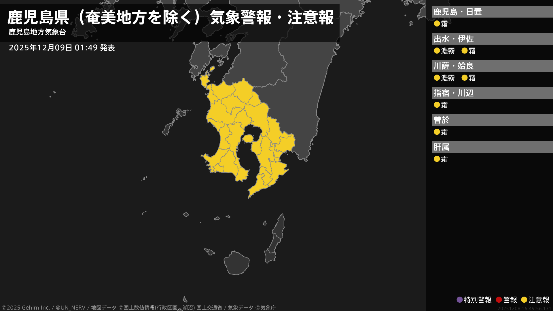【鹿児島県(奄美地方を除く) 気象警報・注意報 2025年12月09日 01:49】薩摩地方では、9日昼前まで濃霧による視程障害に注意してください。薩摩、大隅地方では、9日朝は霜に対する農作物の管理に注意してください。#気象警報注意報 #鹿児島県(奄美地方除く)