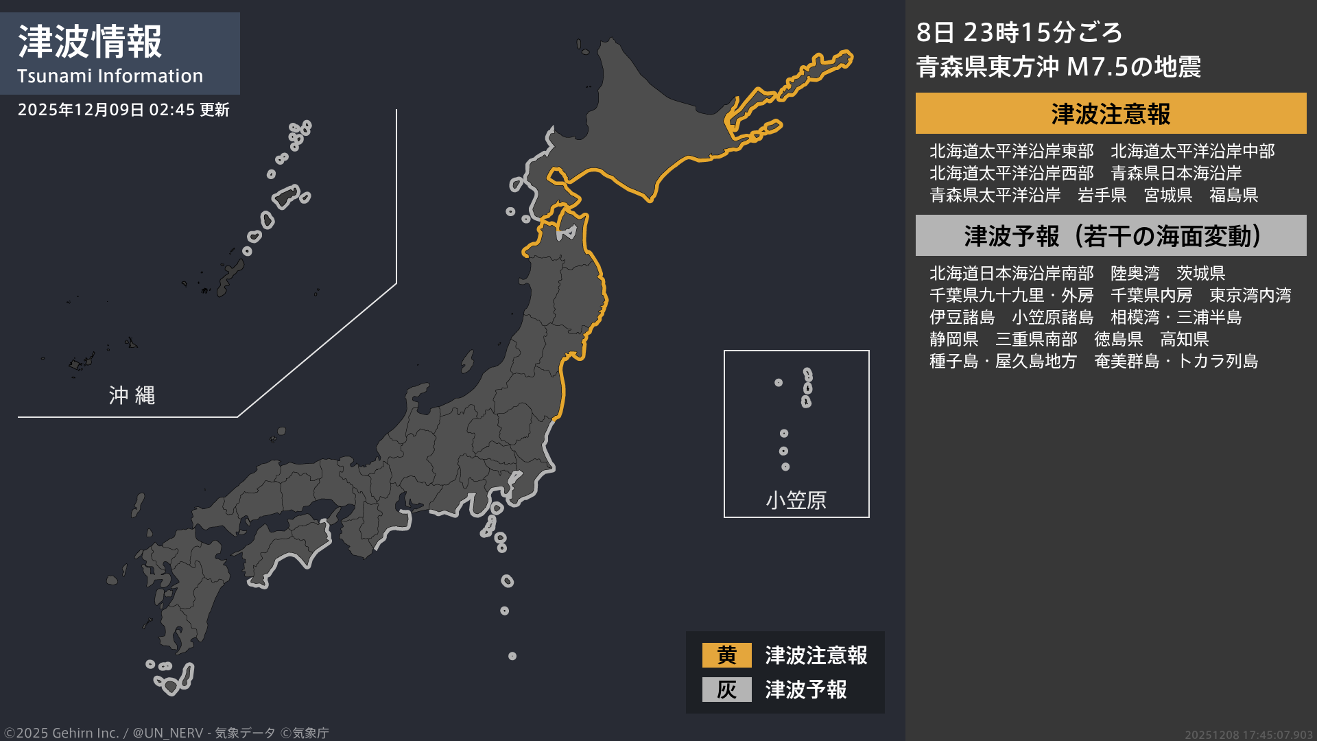【津波情報 2025年12月9日】津波注意報に切り替えました。[震源に関する情報]8日23時15分頃、青森県東方沖を震源とする地震。震源の深さは約50km、地震の規模はM7.5と推定。#津波 #釧路地方 #根室地方 #十勝地方 #日高地方 #胆振地方 #渡島地方 #青森県 #岩手県 #宮城県 #福島県 #後志地方 #檜山地方 #茨城県 #千葉県 #東京都 #神奈川県 #静岡県 #三重県 #徳島県 #高知県 #鹿児島県(奄美地方除く) #奄美地方