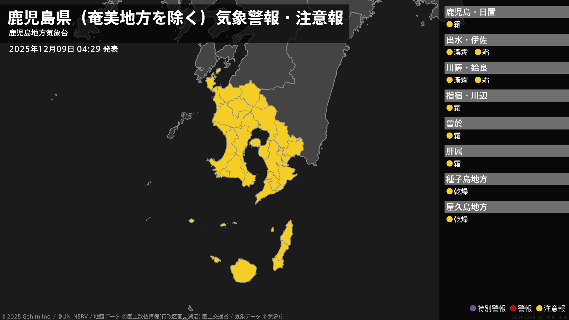 【鹿児島県(奄美地方を除く) 気象警報・注意報 2025年12月09日 04:29】薩摩地方では濃霧による視程障害に、種子島・屋久島地方では空気の乾燥した状態が続くため、火の取り扱いに、薩摩、大隅地方では霜に対する農作物の管理に注意してください。#気象警報注意報 #鹿児島県(奄美地方除く)
