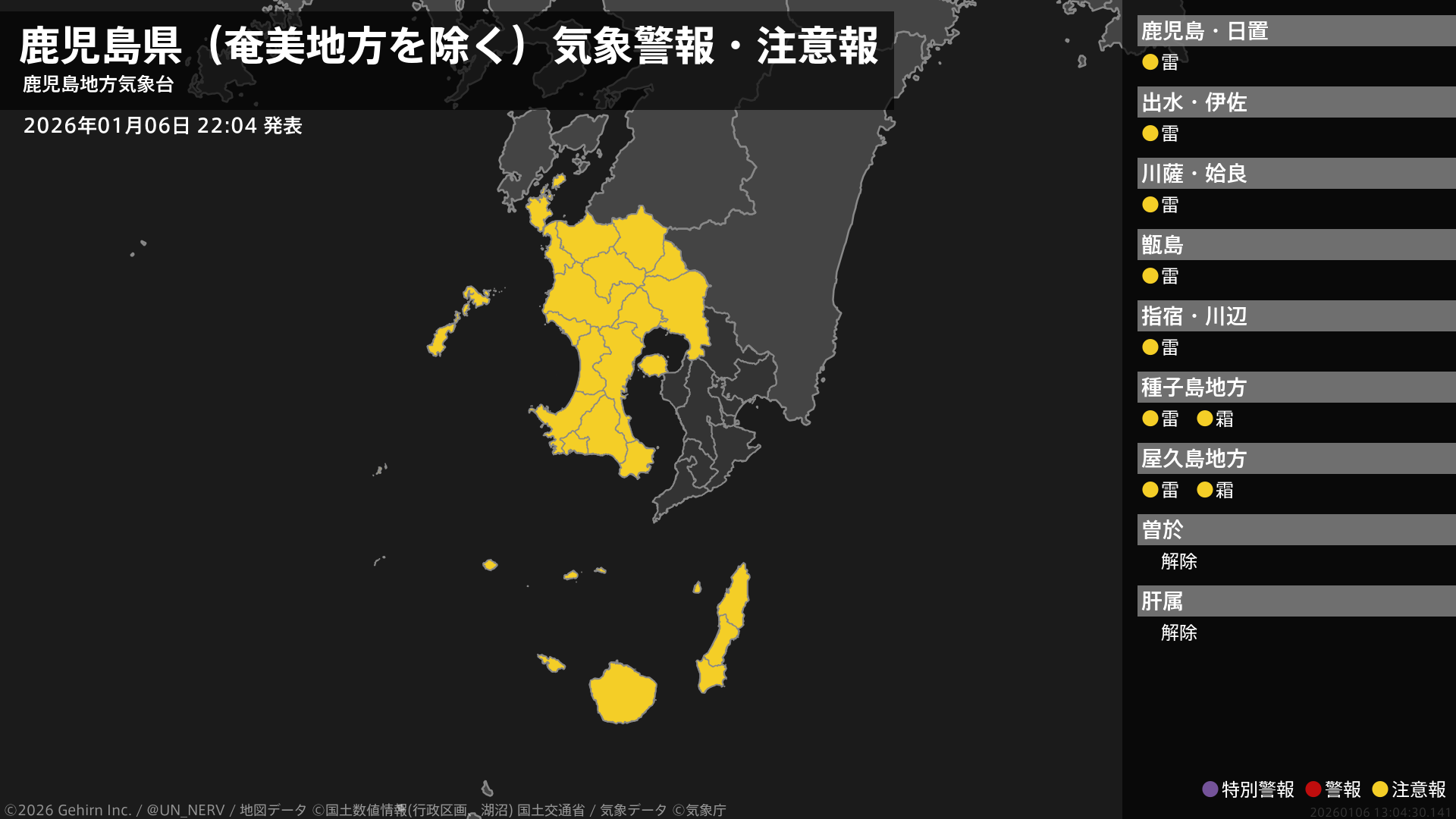【鹿児島県(奄美地方を除く) 気象警報・注意報 2026年01月06日 20:37】薩摩、種子島・屋久島地方では落雷に、薩摩、大隅地方では空気の乾燥した状態が続くため、火の取り扱いに、種子島・屋久島地方では霜に対する農作物の管理に注意してください。#気象警報注意報 #鹿児島県(奄美地方除く)