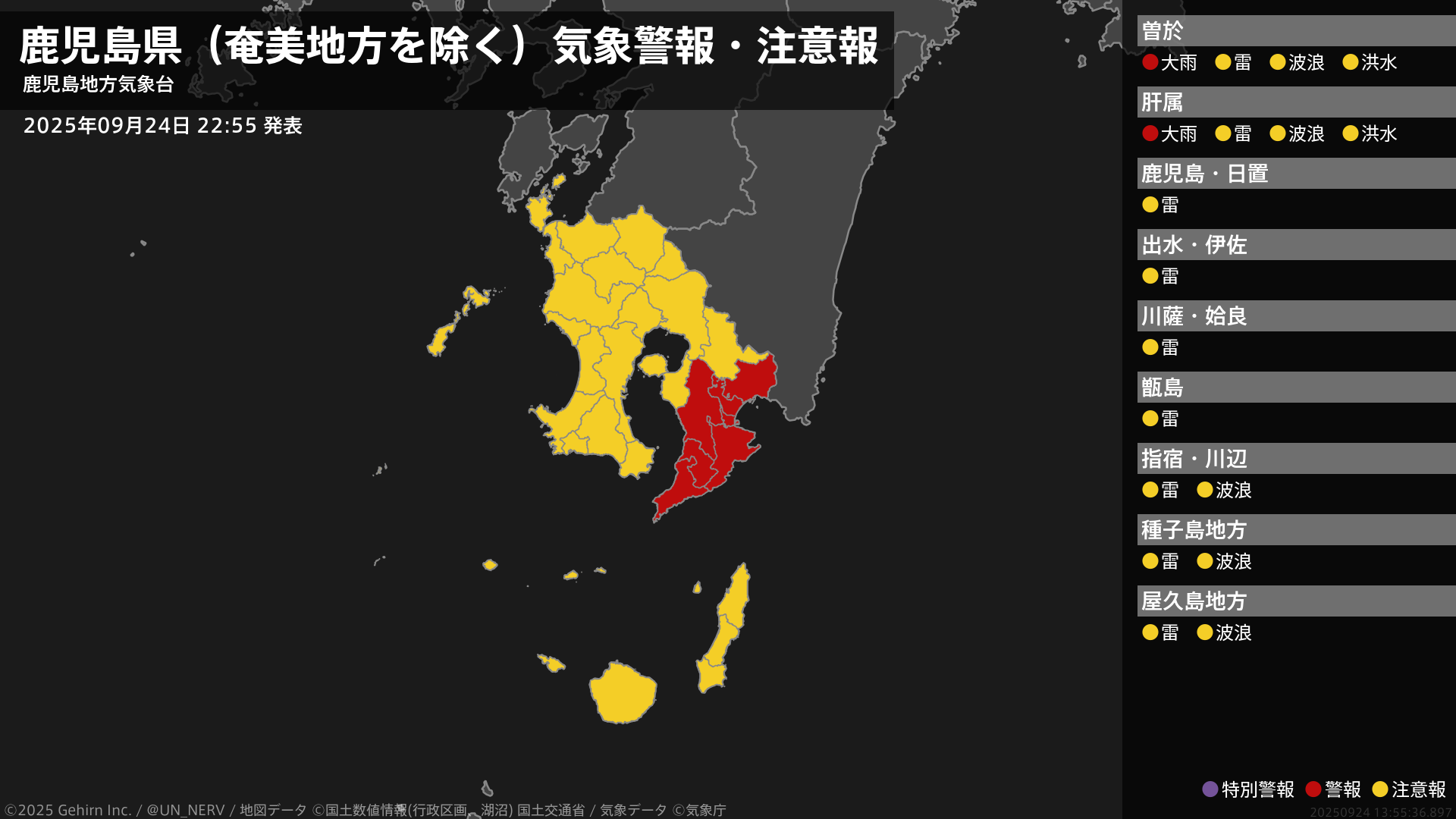 【鹿児島県(奄美地方を除く) 気象警報・注意報 2025年09月24日 22:55】大隅地方では、25日明け方まで土砂災害に警戒してください。#気象警報注意報 #鹿児島県(奄美地方除く)