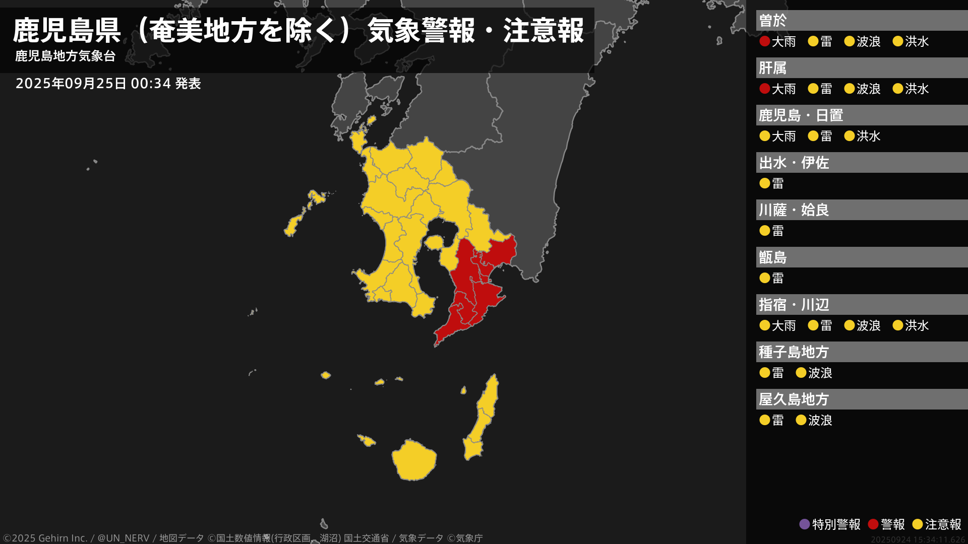 【鹿児島県(奄美地方を除く) 気象警報・注意報 2025年09月25日 00:34】大隅地方では、25日明け方まで土砂災害に警戒してください。#気象警報注意報 #鹿児島県(奄美地方除く)