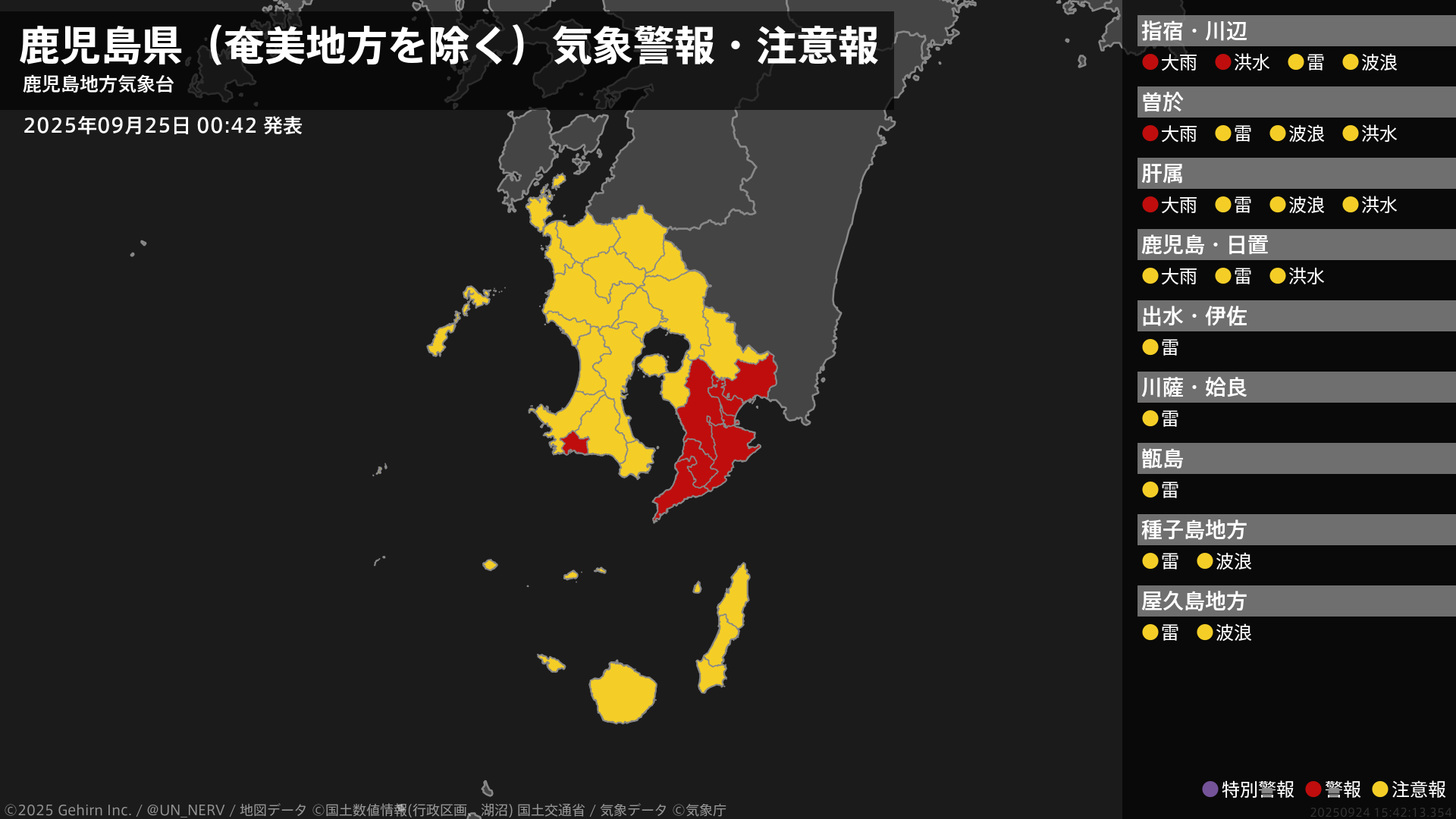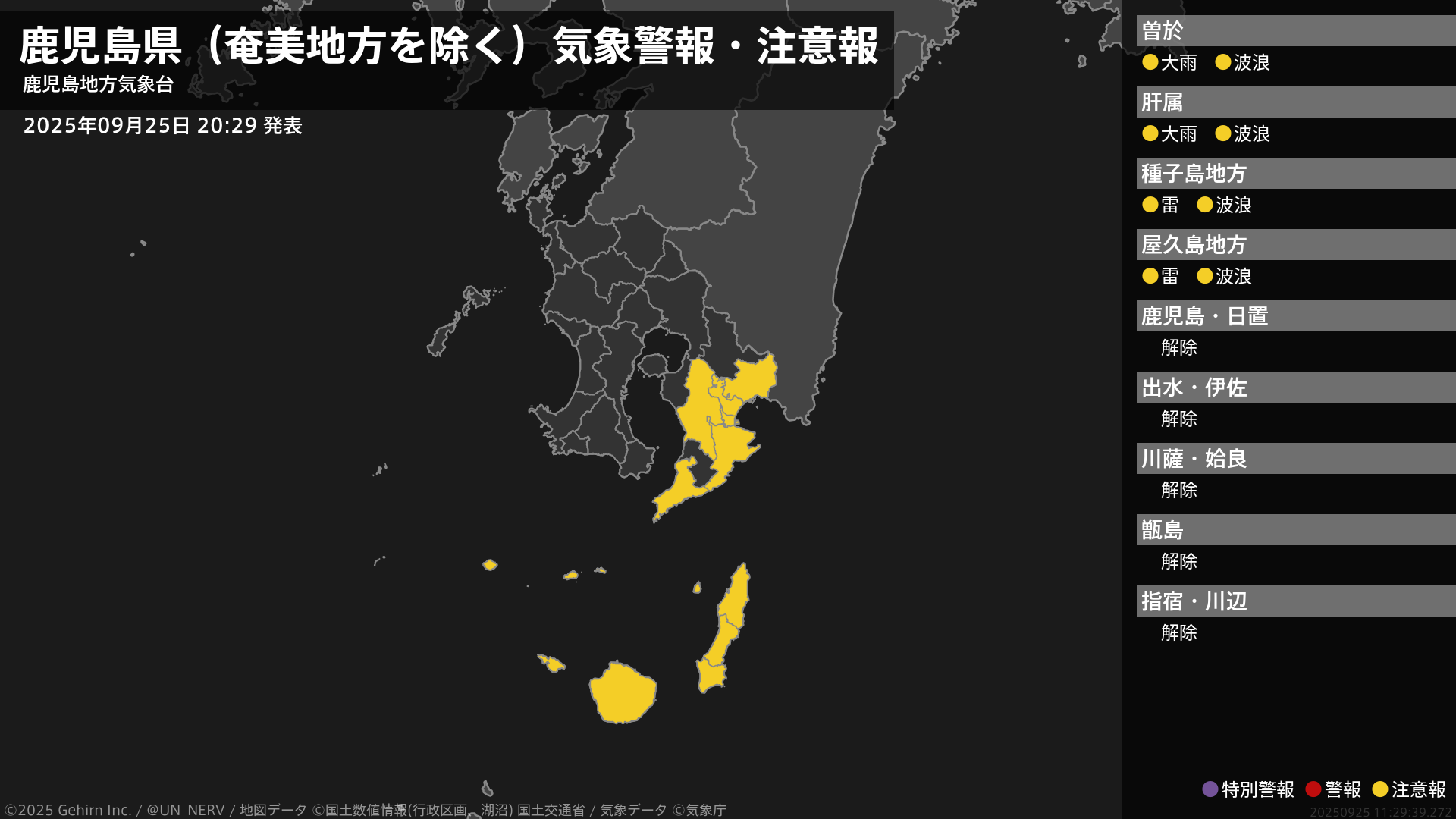 【鹿児島県(奄美地方を除く) 気象警報・注意報 2025年09月25日 20:29】大隅地方では、土砂災害に注意してください。大隅、種子島・屋久島地方では、高波に注意してください。種子島・屋久島地方では、落雷に注意してください。#気象警報注意報 #鹿児島県(奄美地方除く)